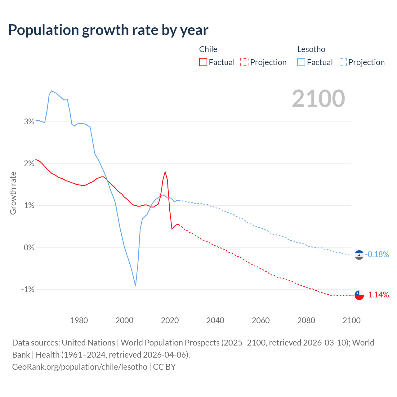 - For the last 10 years, Chile has had an average growth rate of +1.02% per year vs +1.17% in Lesotho.