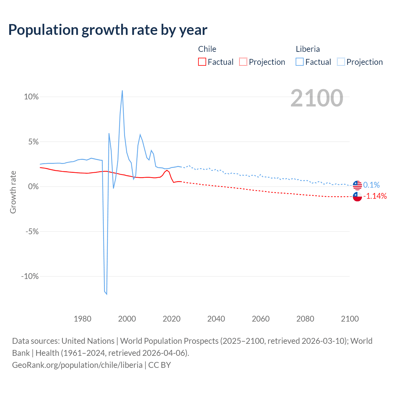 - For the last 10 years, Chile has had an average growth rate of +1.02% per year vs +2.09% in Liberia.