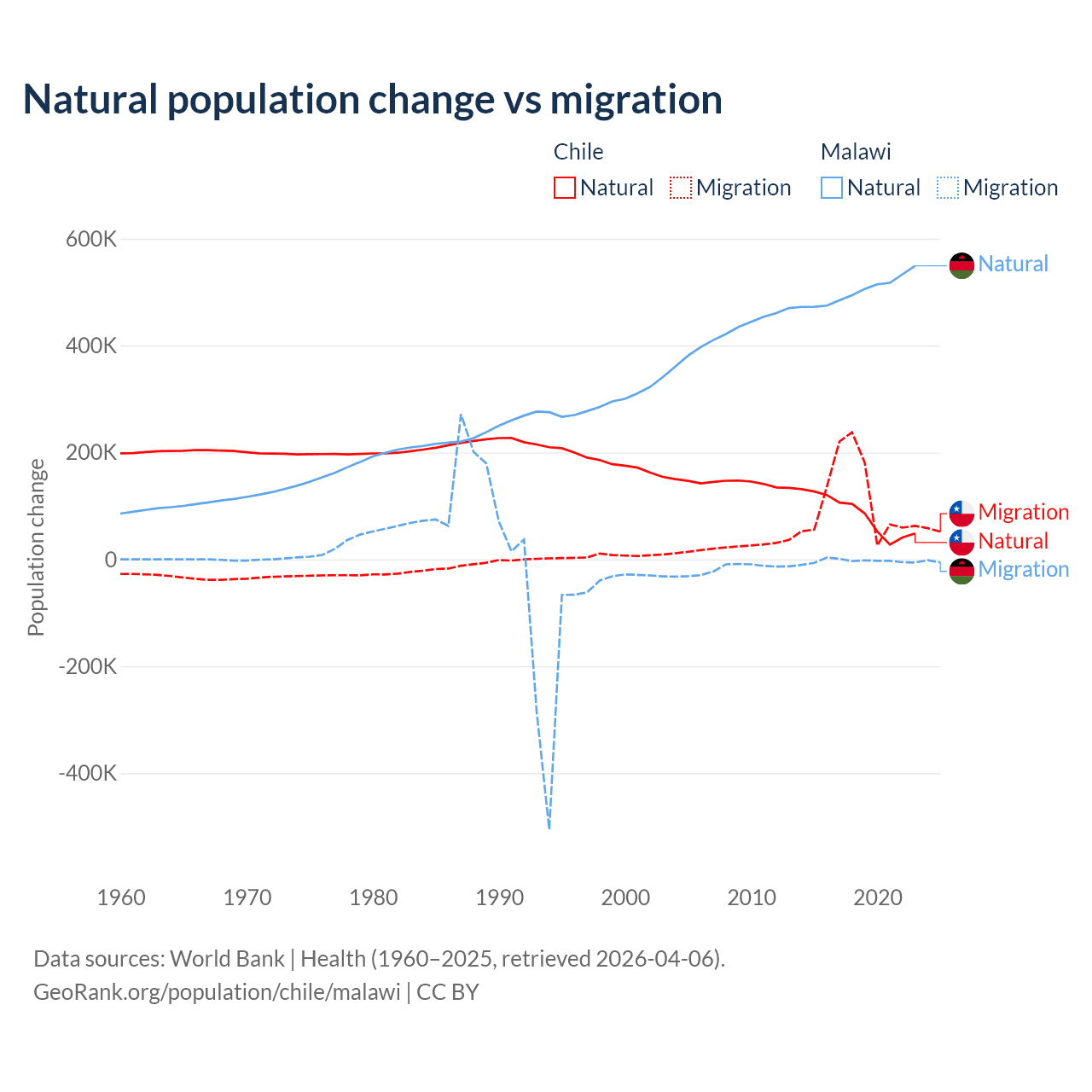 Over the last 10 years, 43.5% of the population change in Chile is from natural causes (a gain of 844,683 people) and 56.5% is from migration (a gain of 1,097,597 people). In Malawi 99.3% is from natural causes (a gain of 5,019,393 people) and 0.67% is from migration (a loss of 33,768 people).