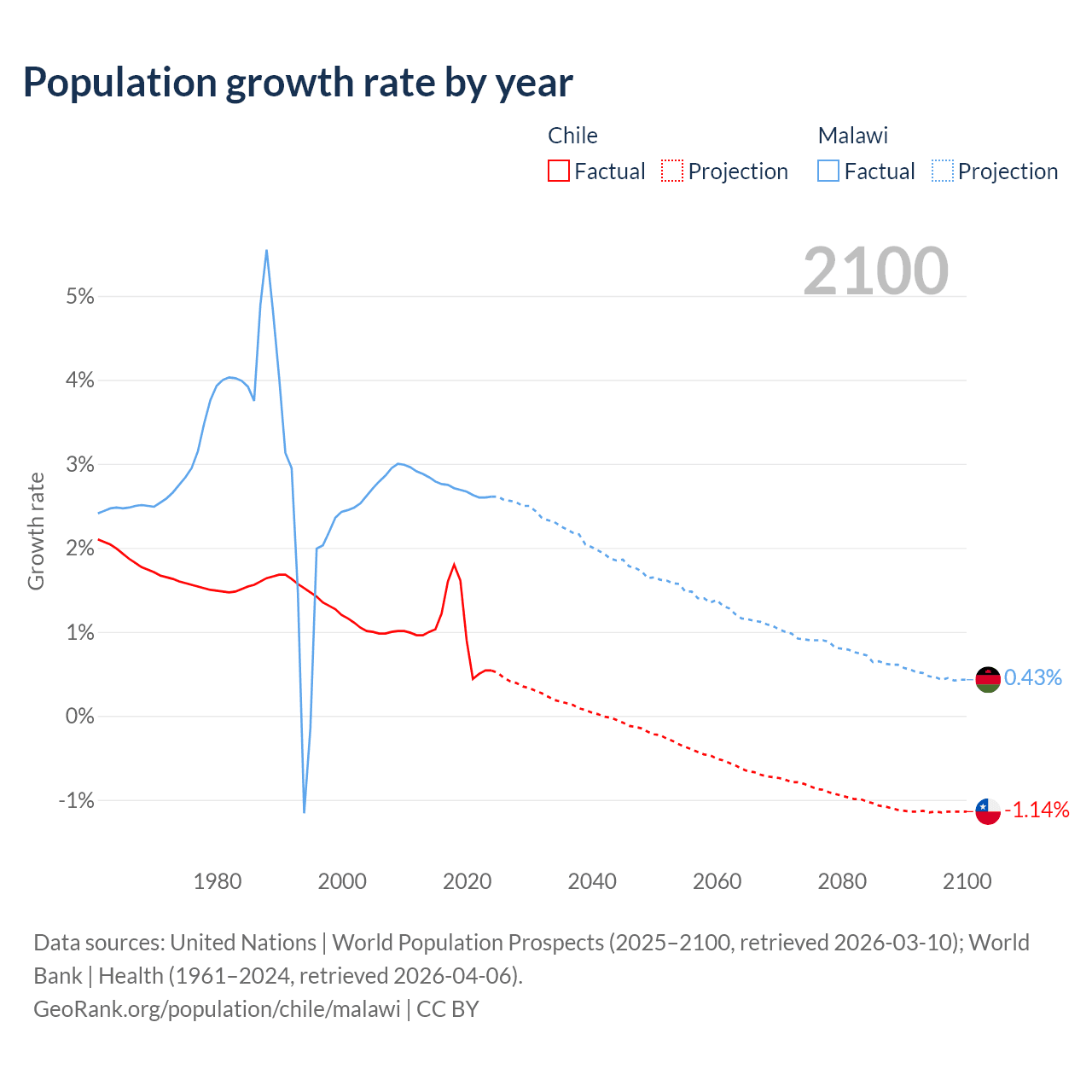 - For the last 10 years, Chile has had an average growth rate of +1.02% per year vs +2.7% in Malawi.