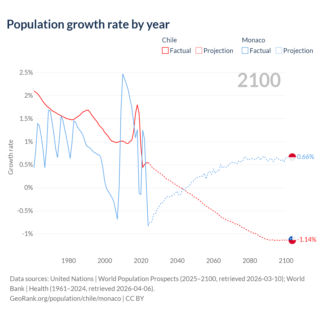 - For the last 10 years, Chile has had an average growth rate of +1.02% per year vs +0.79% in Monaco.