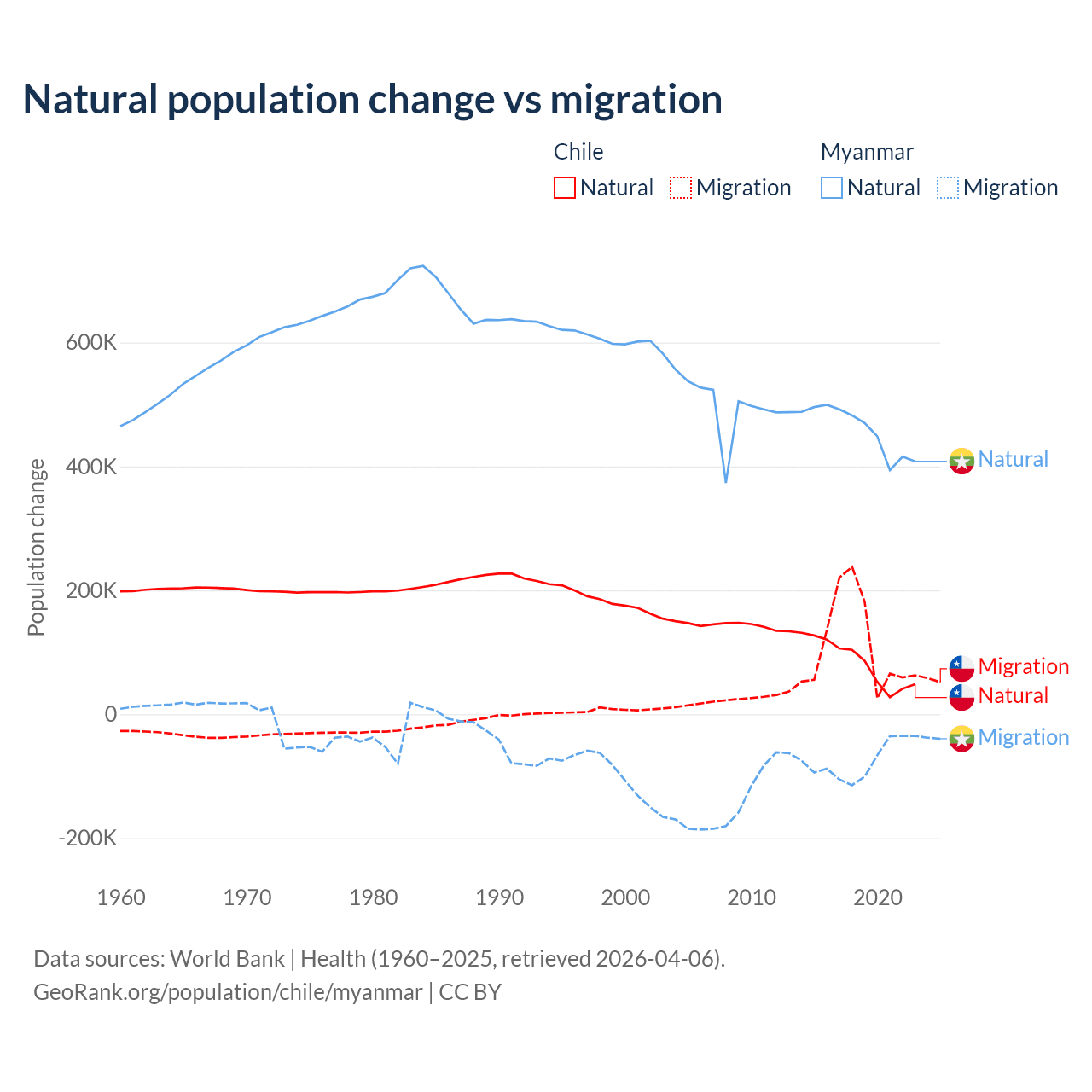 Over the last 10 years, 43.5% of the population change in Chile is from natural causes (a gain of 844,683 people) and 56.5% is from migration (a gain of 1,097,597 people). In Myanmar 86% is from natural causes (a gain of 4,594,615 people) and 14% is from migration (a loss of 749,272 people).