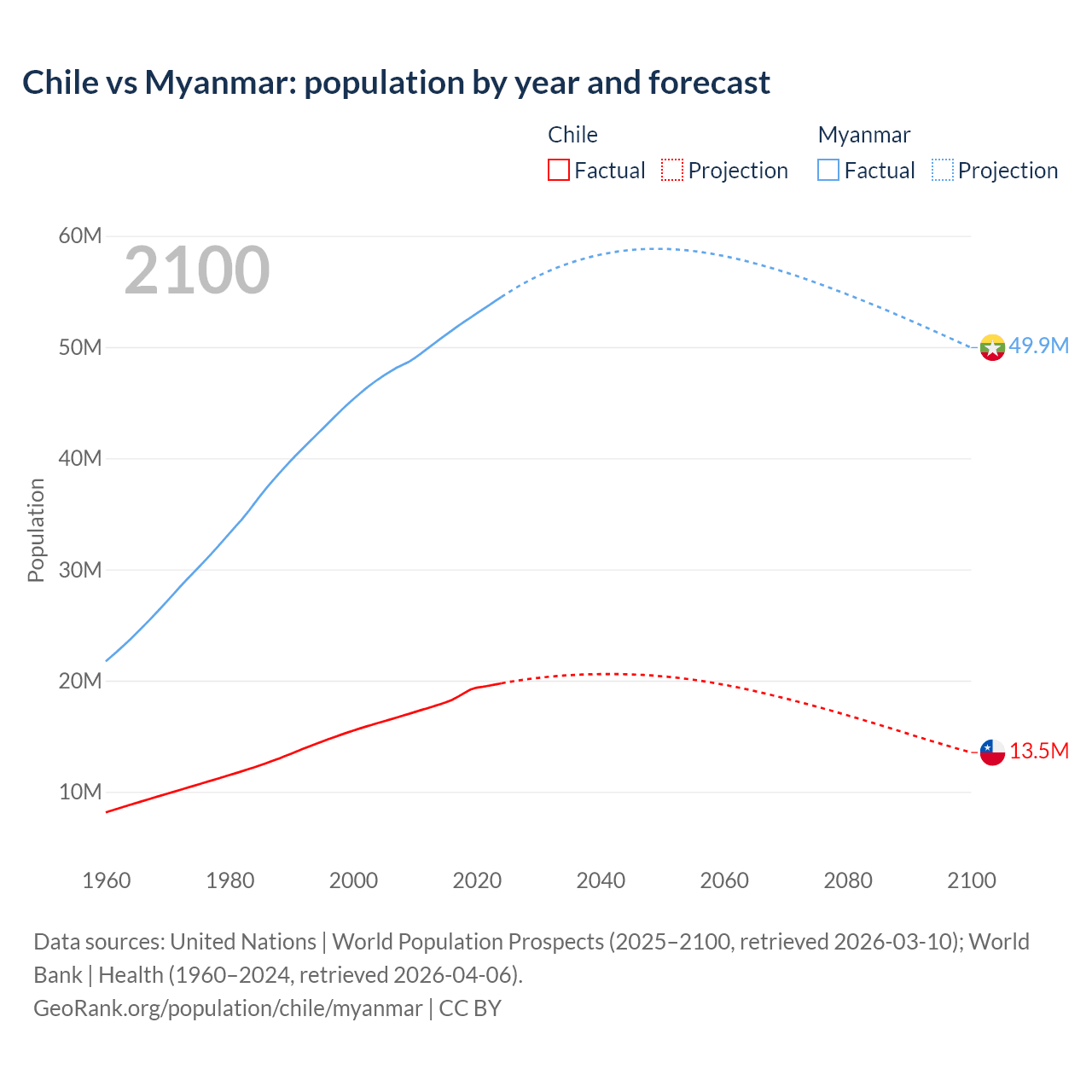 The latest officially reported population of Chile was 19,764,771 in 2024 vs 54,500,091 people in Myanmar in 2024. In 2026, based on the adjusted UN estimation, the current Chile's population is 19,977,856 people compared to 55,292,116 in Myanmar.