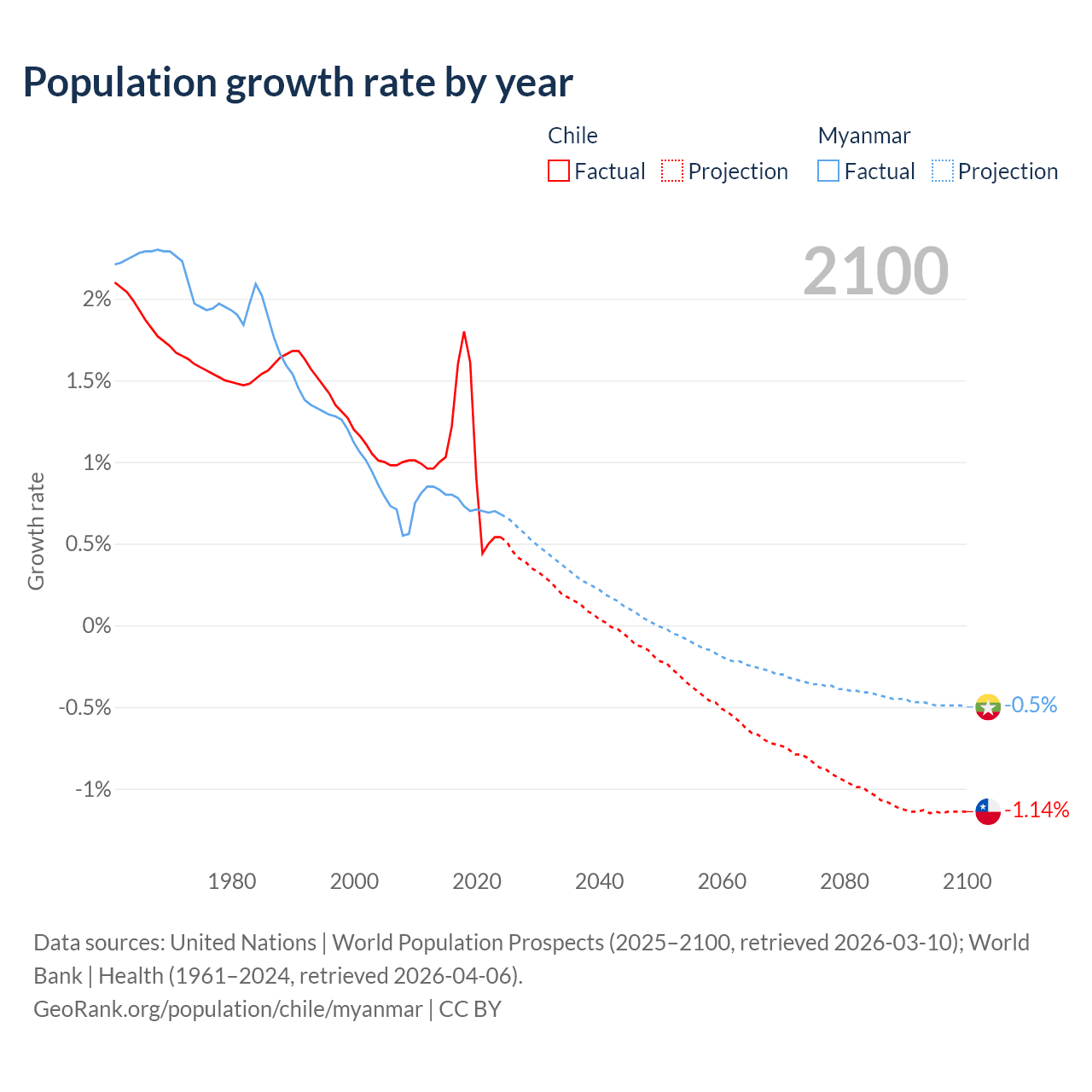 - For the last 10 years, Chile has had an average growth rate of +1.02% per year vs +0.74% in Myanmar.