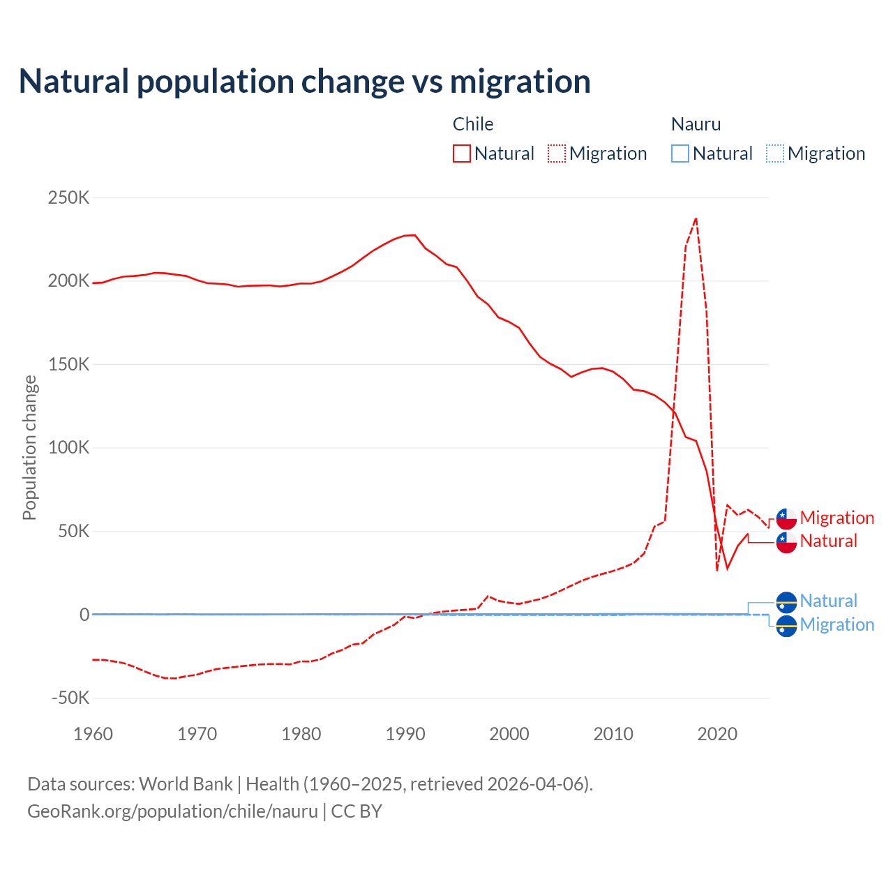 Over the last 10 years, 43.5% of the population change in Chile is from natural causes (a gain of 844,683 people) and 56.5% is from migration (a gain of 1,097,597 people). In Nauru 66.2% is from natural causes (a gain of 2,590 people) and 33.8% is from migration (a loss of 1,320 people).