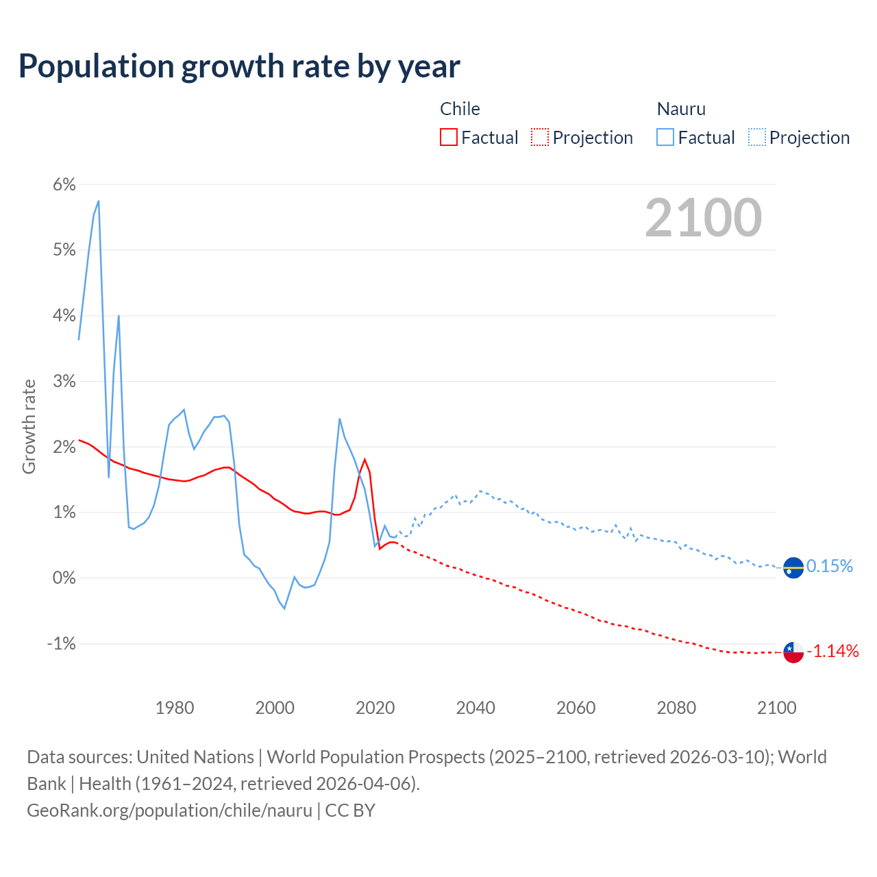 - For the last 10 years, Chile has had an average growth rate of +1.02% per year vs +1.17% in Nauru.
