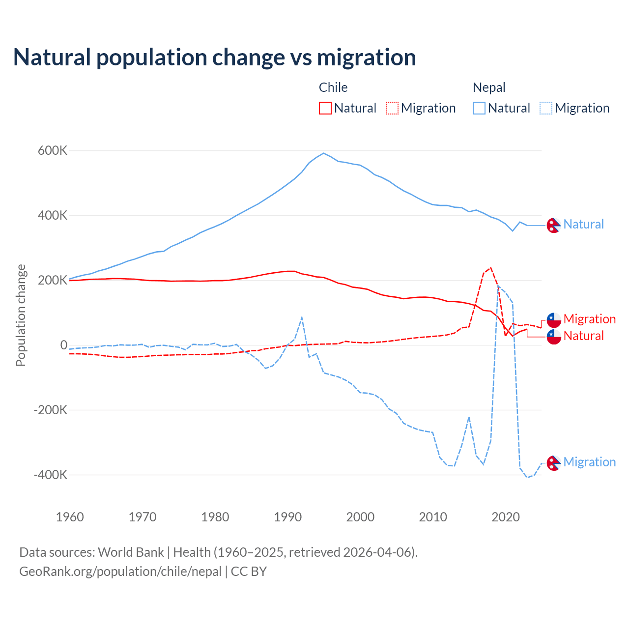 Over the last 10 years, 43.5% of the population change in Chile is from natural causes (a gain of 844,683 people) and 56.5% is from migration (a gain of 1,097,597 people). In Nepal 67.9% is from natural causes (a gain of 3,909,749 people) and 32.1% is from migration (a loss of 1,851,664 people).