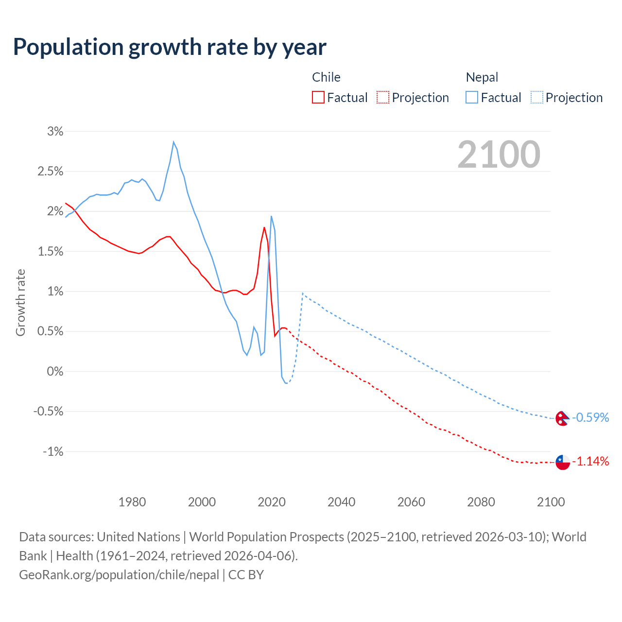 - For the last 10 years, Chile has had an average growth rate of +1.02% per year vs +0.66% in Nepal.