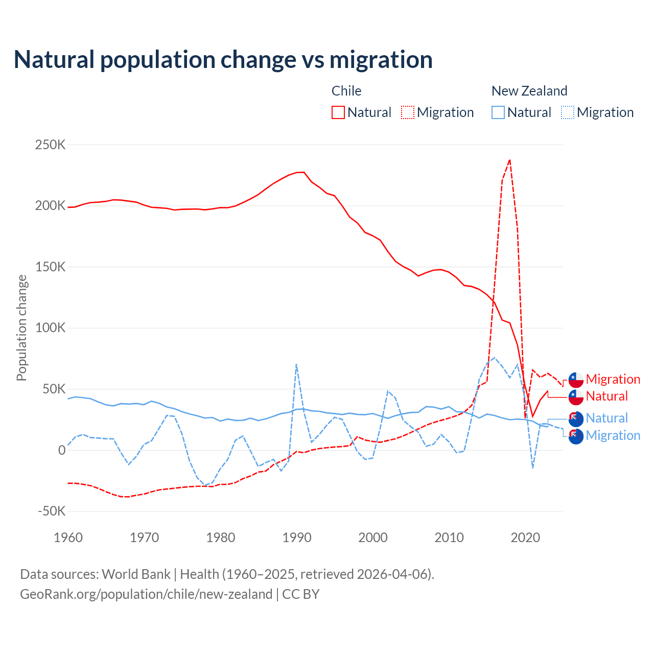 Over the last 10 years, 43.5% of the population change in Chile is from natural causes (a gain of 844,683 people) and 56.5% is from migration (a gain of 1,097,597 people). In New Zealand 34.4% is from natural causes (a gain of 247,767 people) and 65.6% is from migration (a gain of 471,602 people).