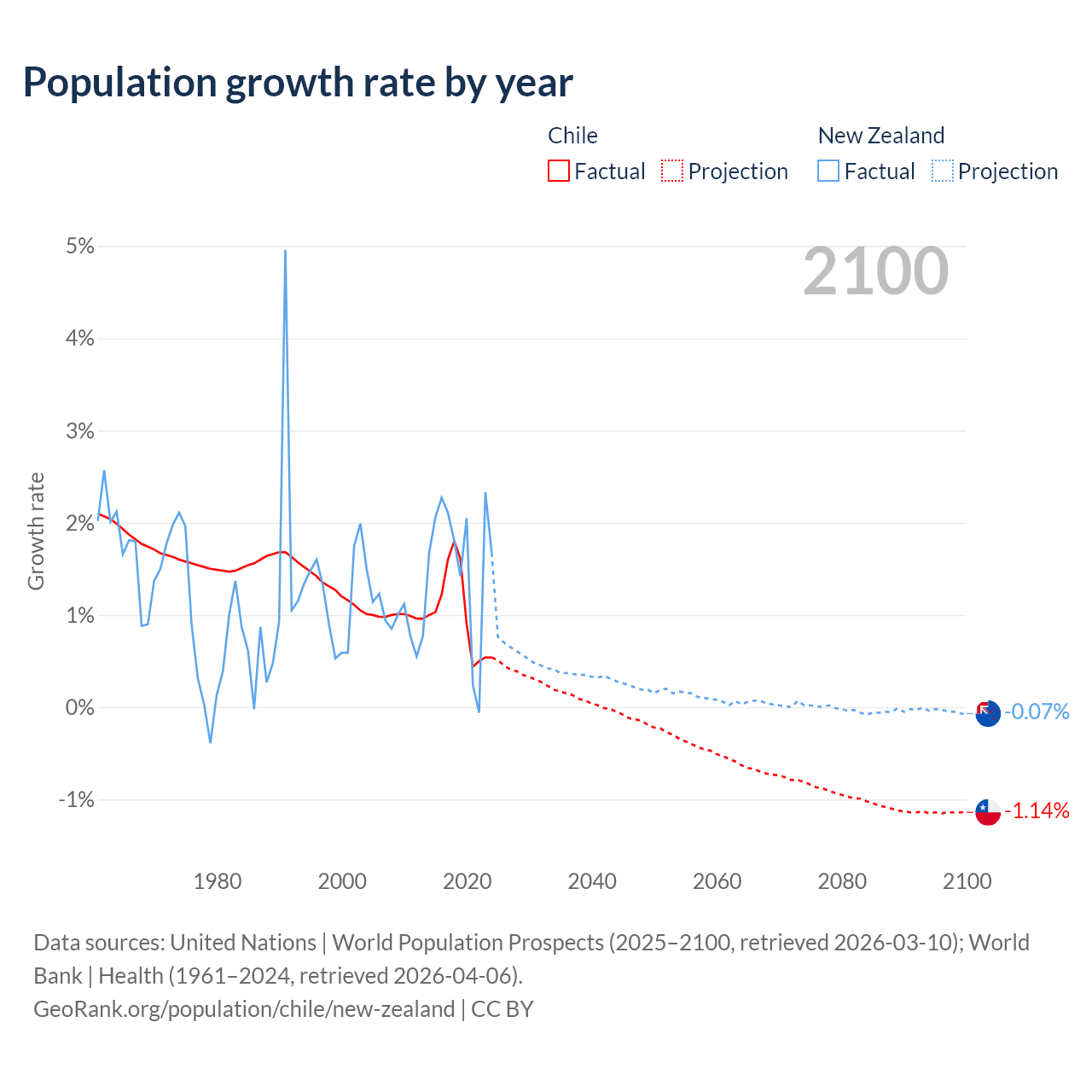 - For the last 10 years, Chile has had an average growth rate of +1.02% per year vs +1.6% in New Zealand.