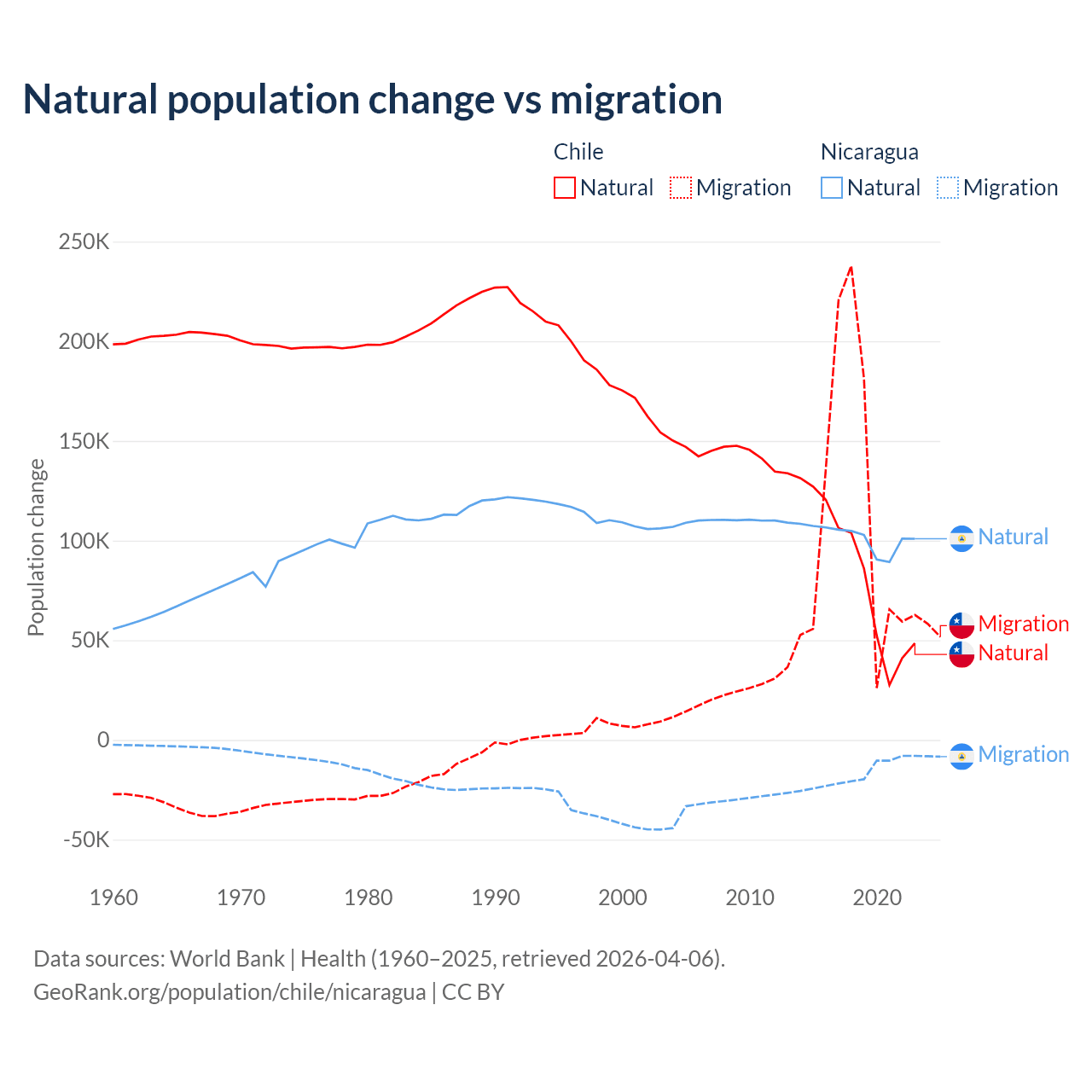 Over the last 10 years, 43.5% of the population change in Chile is from natural causes (a gain of 844,683 people) and 56.5% is from migration (a gain of 1,097,597 people). In Nicaragua 85.5% is from natural causes (a gain of 1,017,084 people) and 14.5% is from migration (a loss of 172,078 people).