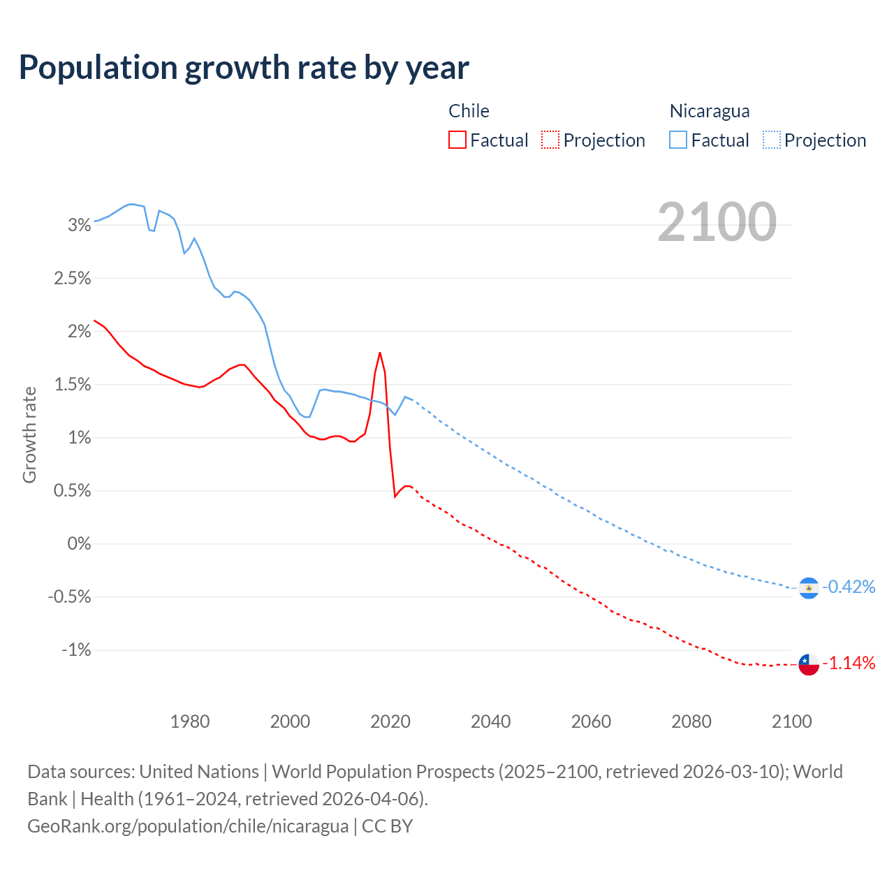 - For the last 10 years, Chile has had an average growth rate of +1.02% per year vs +1.33% in Nicaragua.