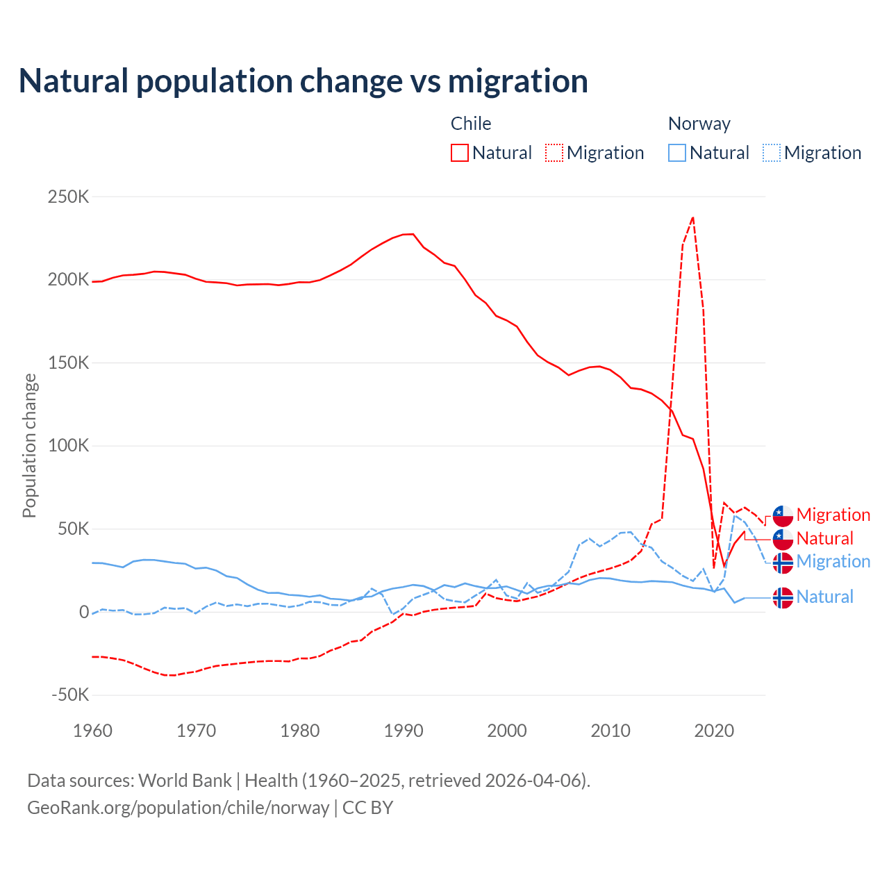 Over the last 10 years, 43.5% of the population change in Chile is from natural causes (a gain of 844,683 people) and 56.5% is from migration (a gain of 1,097,597 people). In Norway 31.3% is from natural causes (a gain of 138,699 people) and 68.7% is from migration (a gain of 303,945 people).