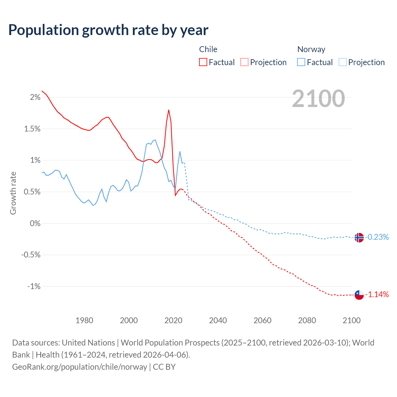 - For the last 10 years, Chile has had an average growth rate of +1.02% per year vs +0.85% in Norway.