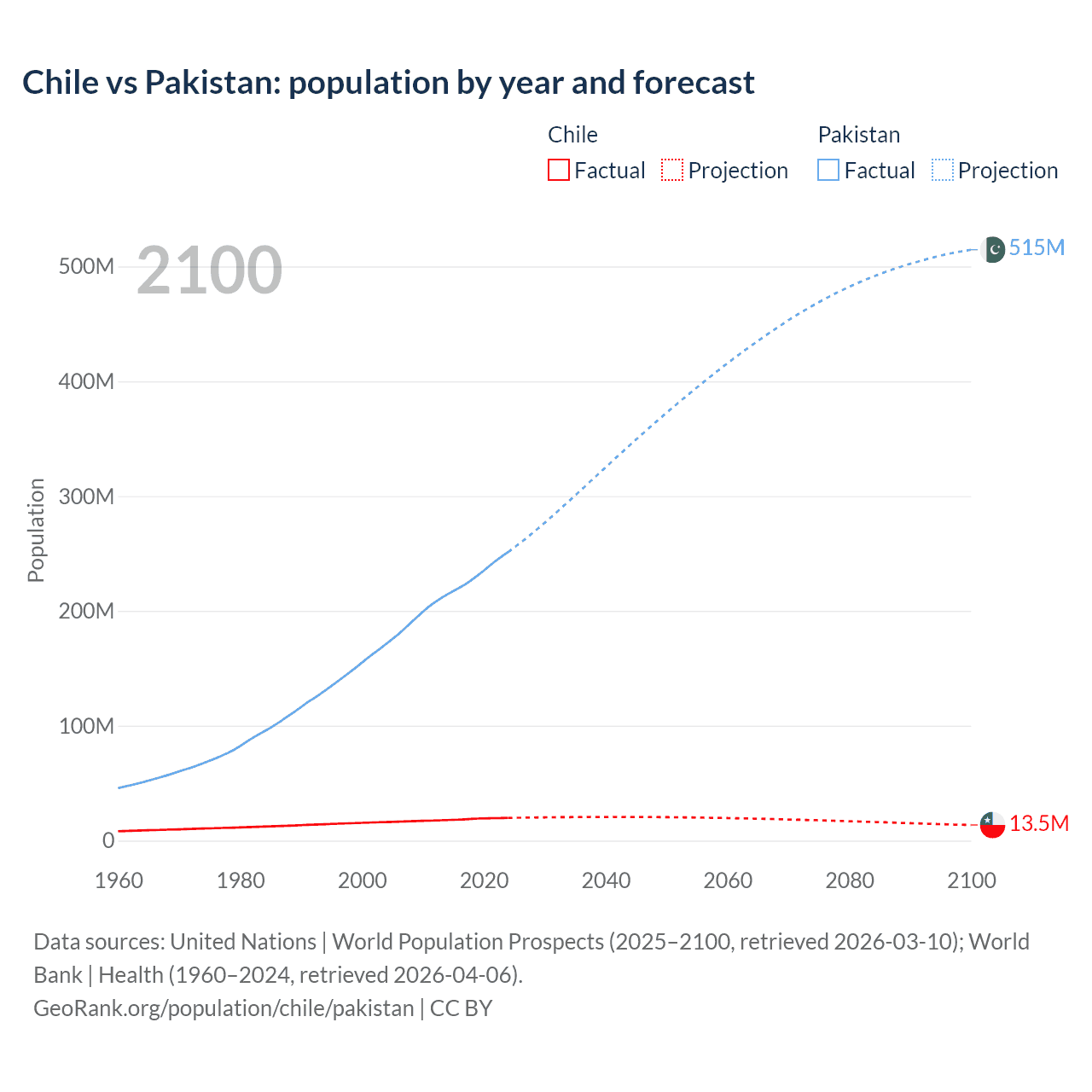 The latest officially reported population of Chile was 19,764,771 in 2024 vs 251,269,164 people in Pakistan in 2024. In 2026, based on the adjusted UN estimation, the current Chile's population is 19,977,856 people compared to 260,356,147 in Pakistan.