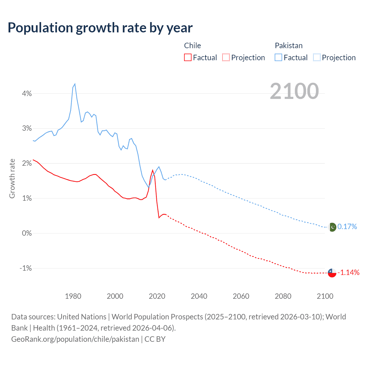 - For the last 10 years, Chile has had an average growth rate of +1.02% per year vs +1.6% in Pakistan.