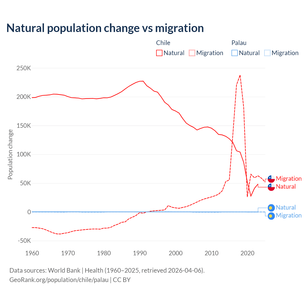 Over the last 10 years, 43.5% of the population change in Chile is from natural causes (a gain of 844,683 people) and 56.5% is from migration (a gain of 1,097,597 people). In Palau 53.8% is from natural causes (a gain of 264 people) and 46.2% is from migration (a loss of 227 people).