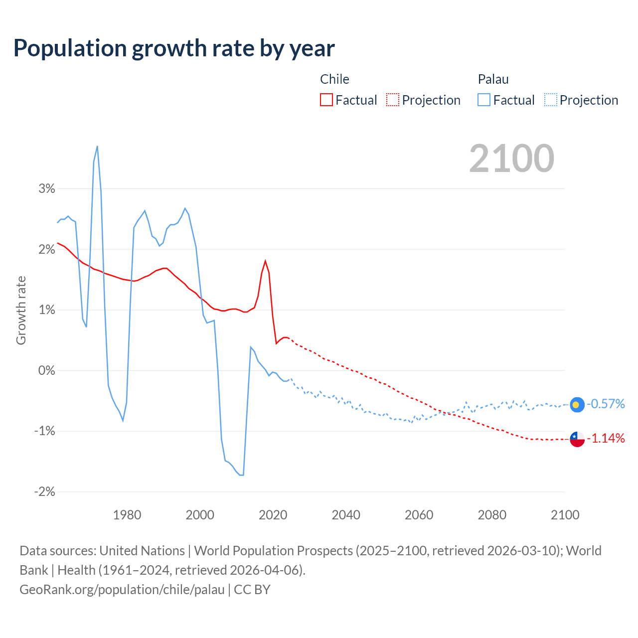 - For the last 10 years, Chile has had an average growth rate of +1.02% per year vs +0.02% in Palau.