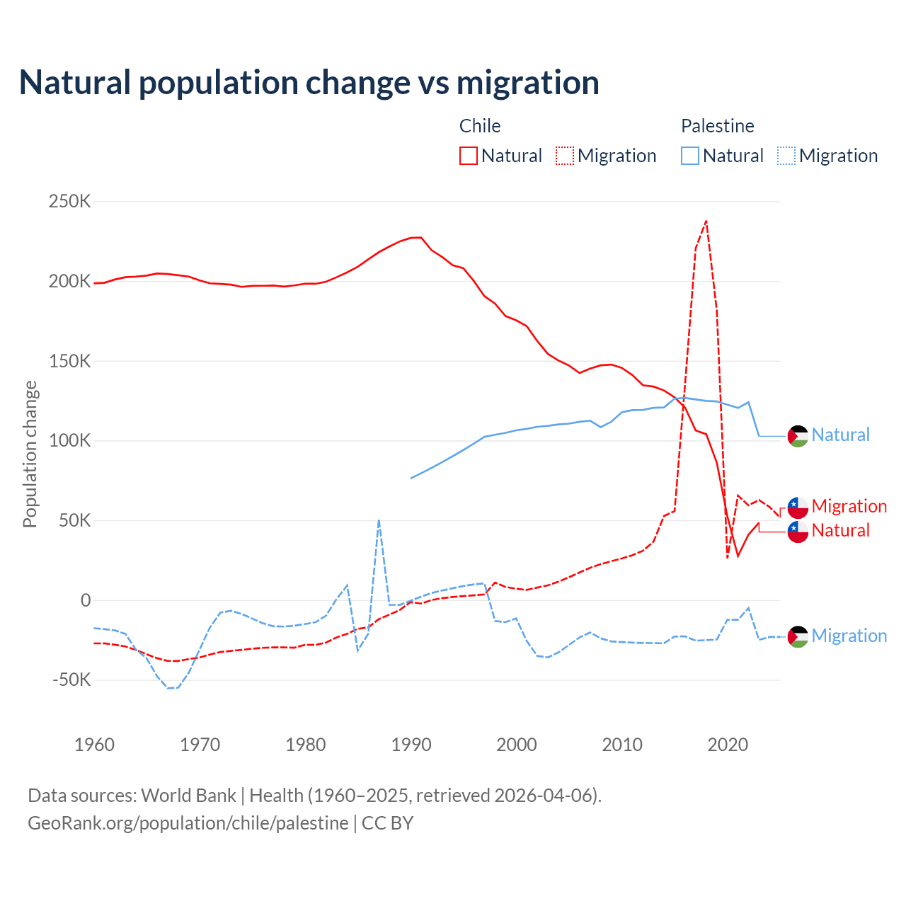 Over the last 10 years, 43.5% of the population change in Chile is from natural causes (a gain of 844,683 people) and 56.5% is from migration (a gain of 1,097,597 people). In Palestine 85.7% is from natural causes (a gain of 1,218,010 people) and 14.3% is from migration (a loss of 202,820 people).