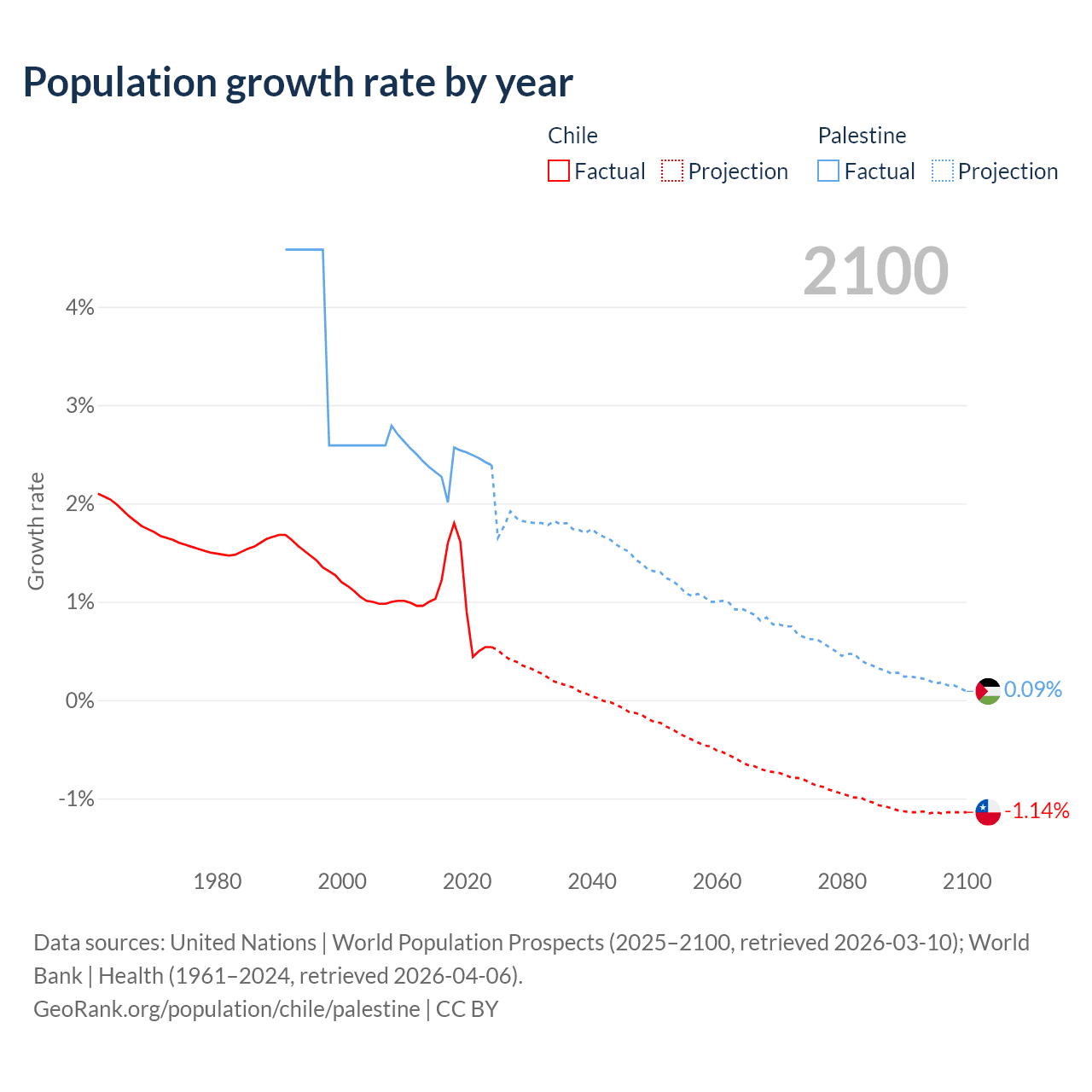 - For the last 10 years, Chile has had an average growth rate of +1.02% per year vs +2.4% in Palestine.
