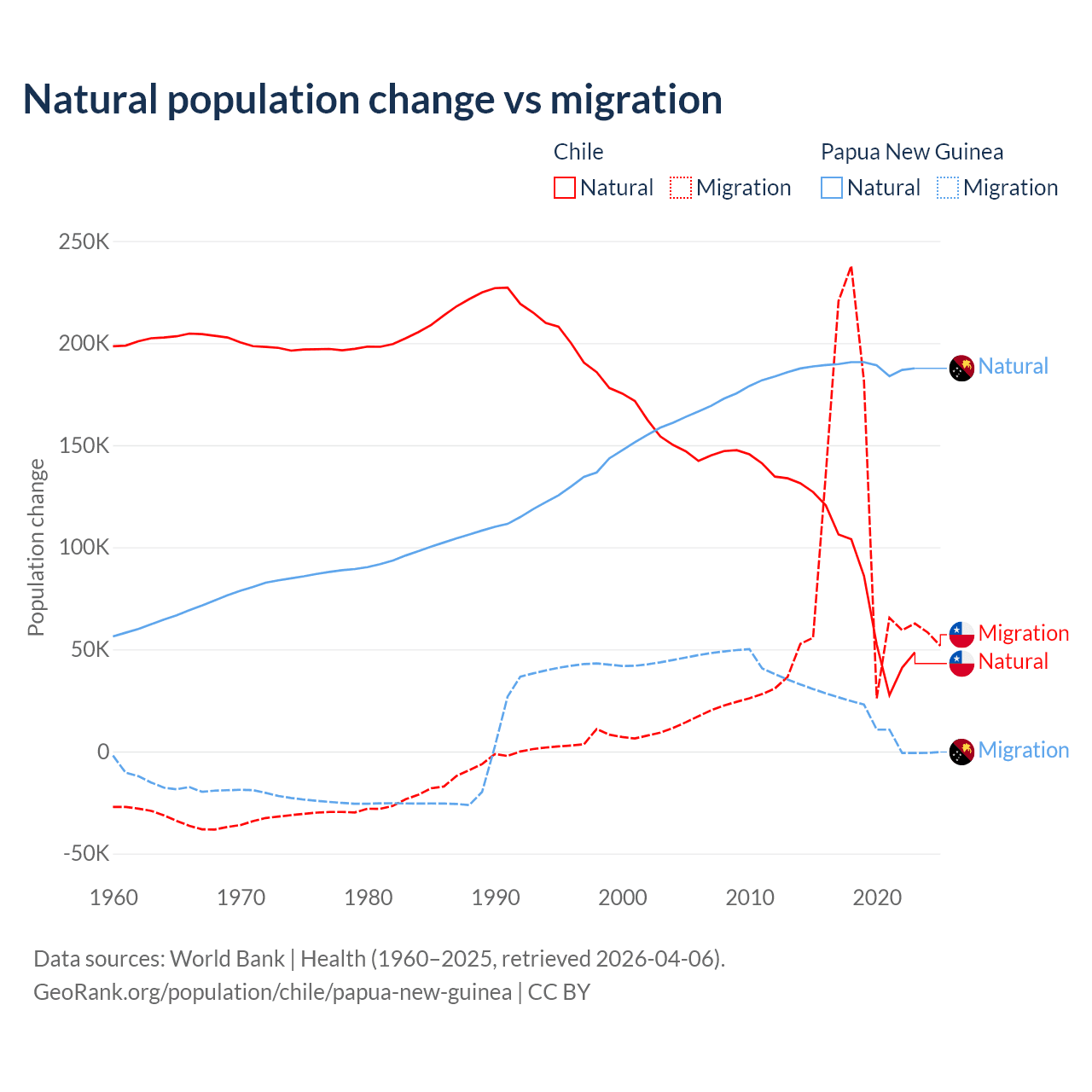 Over the last 10 years, 43.5% of the population change in Chile is from natural causes (a gain of 844,683 people) and 56.5% is from migration (a gain of 1,097,597 people). In Papua New Guinea 91% is from natural causes (a gain of 1,883,906 people) and 8.98% is from migration (a gain of 185,900 people).