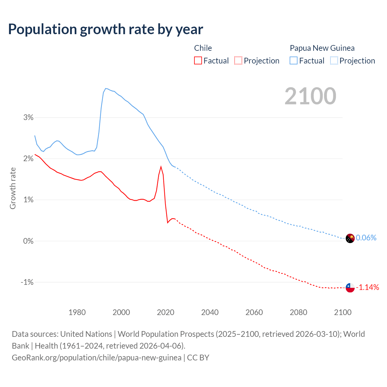 - For the last 10 years, Chile has had an average growth rate of +1.02% per year vs +2.23% in Papua New Guinea.