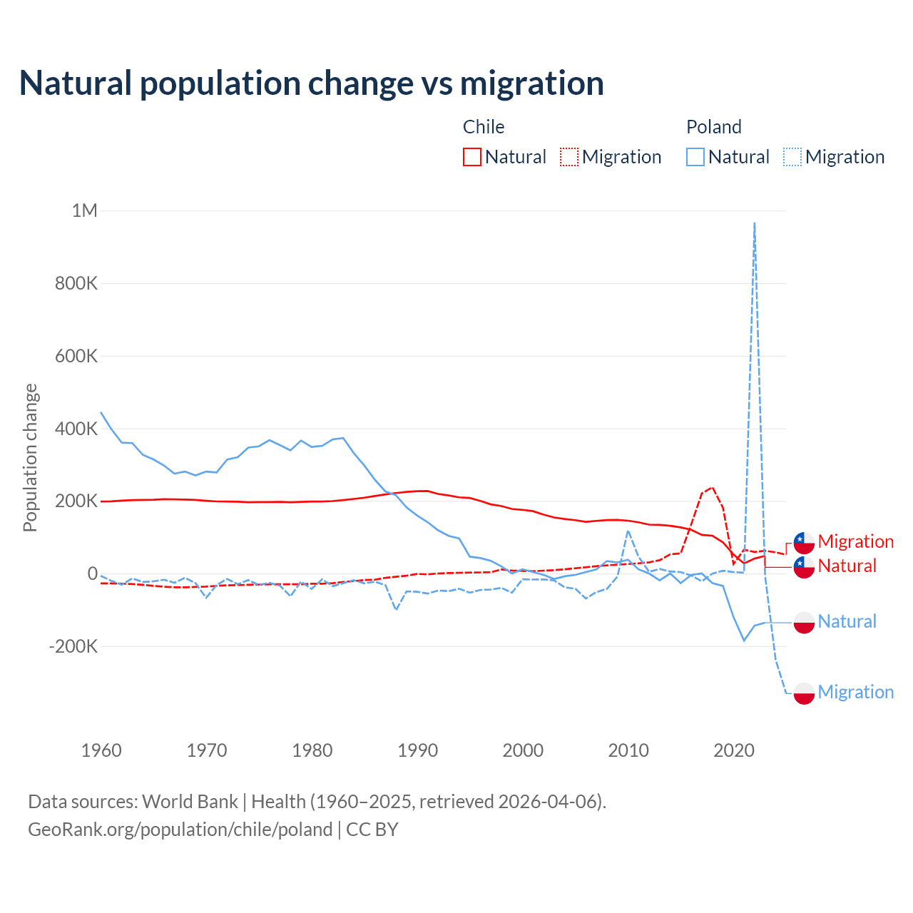 Over the last 10 years, 43.5% of the population change in Chile is from natural causes (a gain of 844,683 people) and 56.5% is from migration (a gain of 1,097,597 people). In Poland 41.4% is from natural causes (a loss of 675,443 people) and 58.6% is from migration (a gain of 955,766 people).