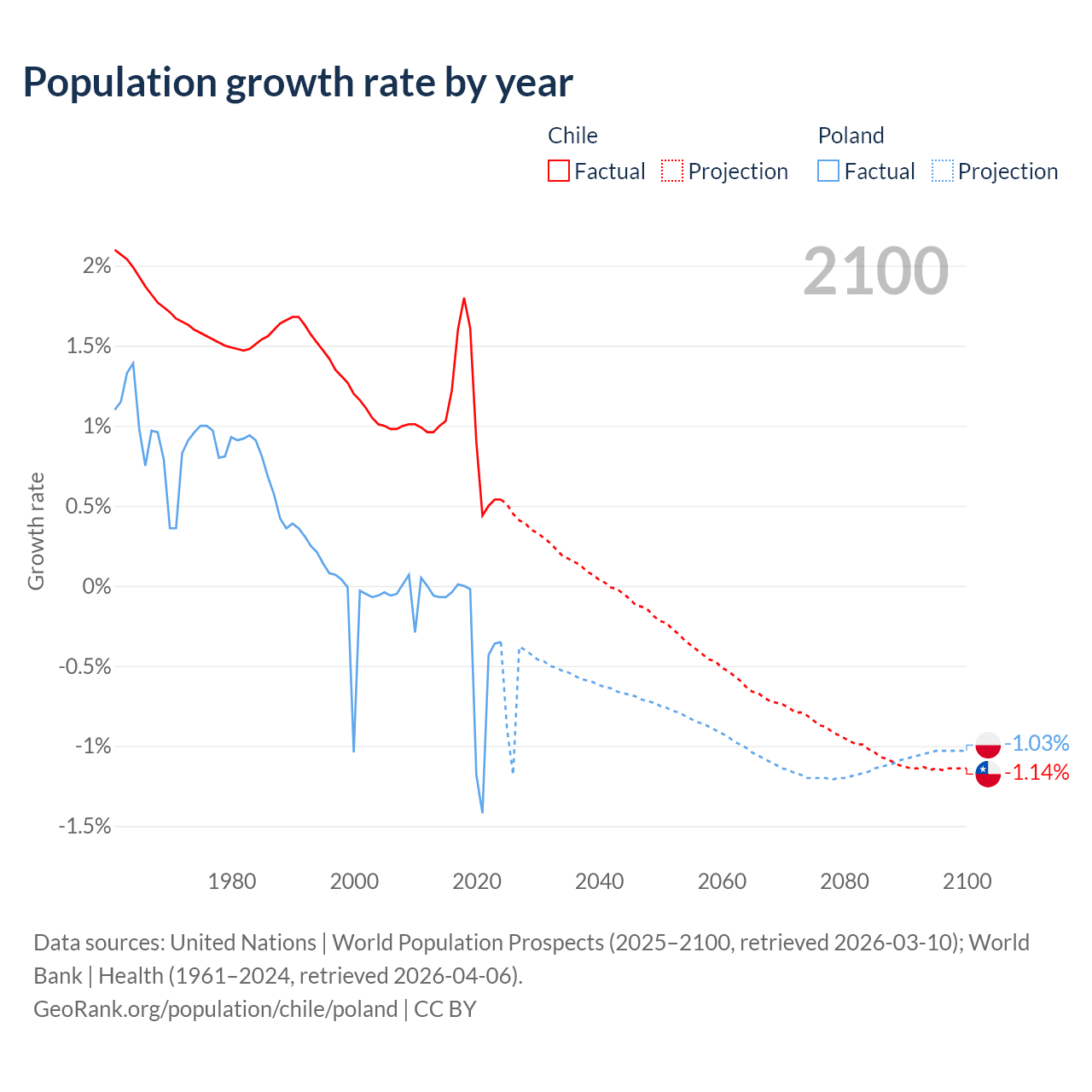 - For the last 10 years, Chile has had an average growth rate of +1.02% per year vs -0.36% in Poland.