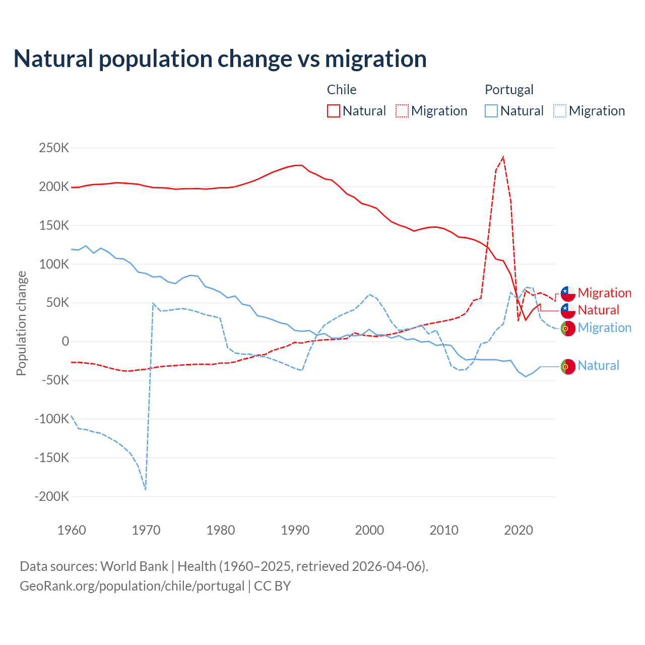 Over the last 10 years, 43.5% of the population change in Chile is from natural causes (a gain of 844,683 people) and 56.5% is from migration (a gain of 1,097,597 people). In Portugal 51% is from natural causes (a loss of 302,748 people) and 49% is from migration (a gain of 290,554 people).