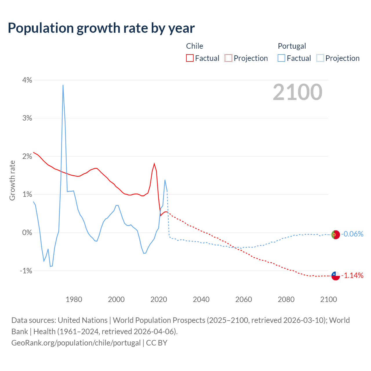 - For the last 10 years, Chile has had an average growth rate of +1.02% per year vs +0.21% in Portugal.