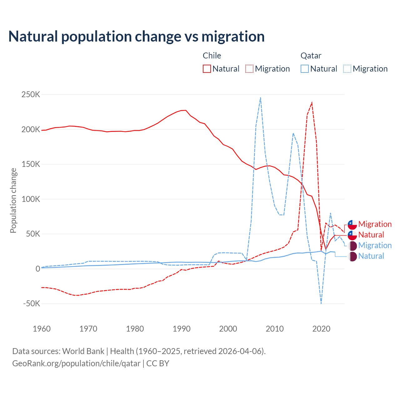 Over the last 10 years, 43.5% of the population change in Chile is from natural causes (a gain of 844,683 people) and 56.5% is from migration (a gain of 1,097,597 people). In Qatar 26.1% is from natural causes (a gain of 232,009 people) and 73.9% is from migration (a gain of 655,712 people).