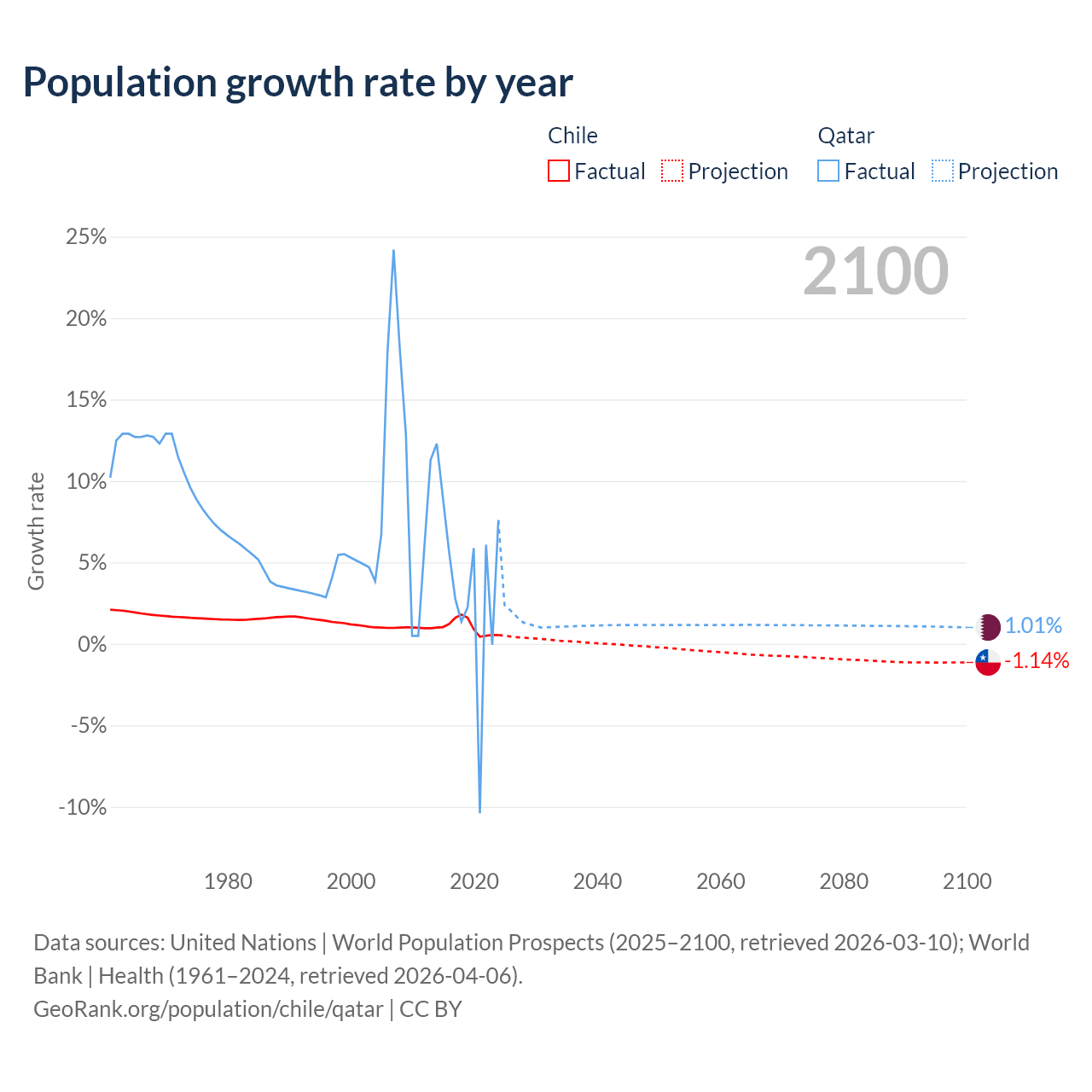 - For the last 10 years, Chile has had an average growth rate of +1.02% per year vs +3.86% in Qatar.
