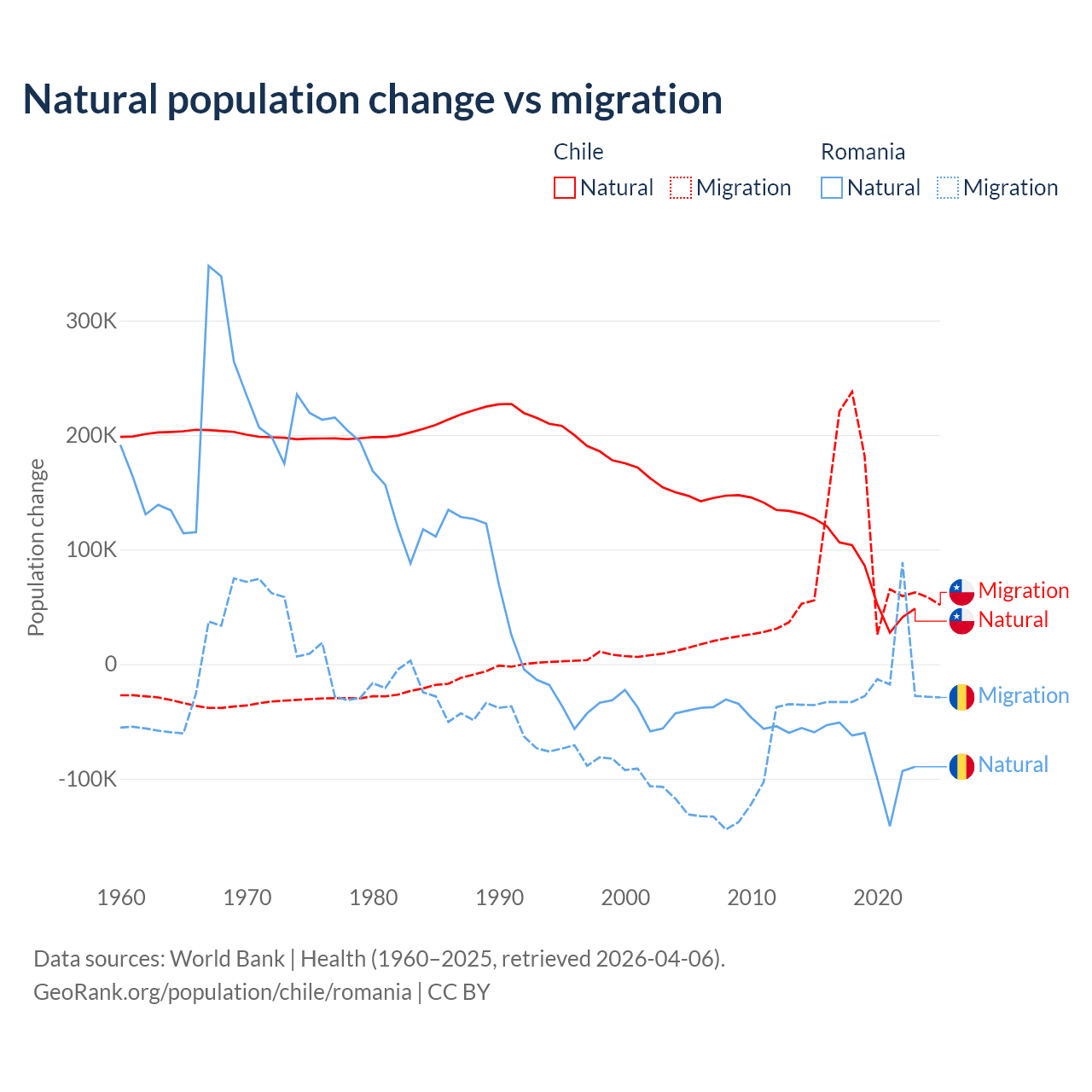 Over the last 10 years, 43.5% of the population change in Chile is from natural causes (a gain of 844,683 people) and 56.5% is from migration (a gain of 1,097,597 people). In Romania 82% is from natural causes (a loss of 766,295 people) and 18% is from migration (a loss of 167,917 people).
