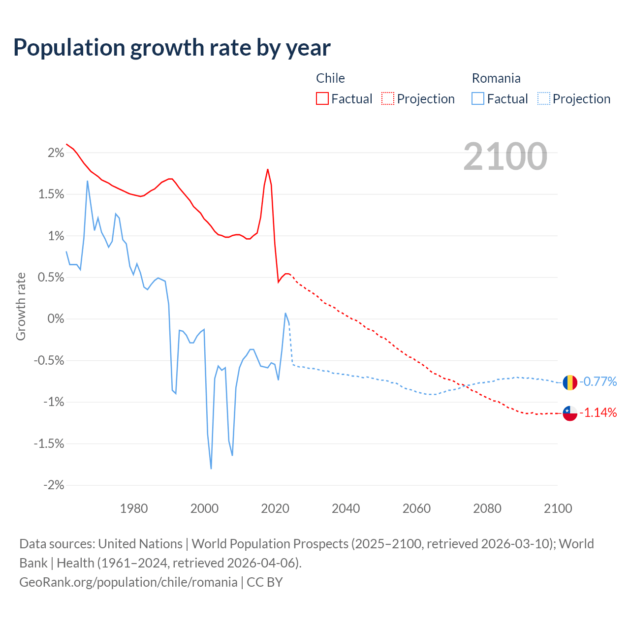 - For the last 10 years, Chile has had an average growth rate of +1.02% per year vs -0.43% in Romania.