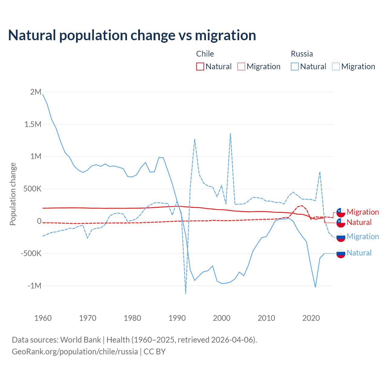 Over the last 10 years, 43.5% of the population change in Chile is from natural causes (a gain of 844,683 people) and 56.5% is from migration (a gain of 1,097,597 people). In Russia 48.6% is from natural causes (a loss of 3,416,377 people) and 51.4% is from migration (a gain of 3,611,826 people).
