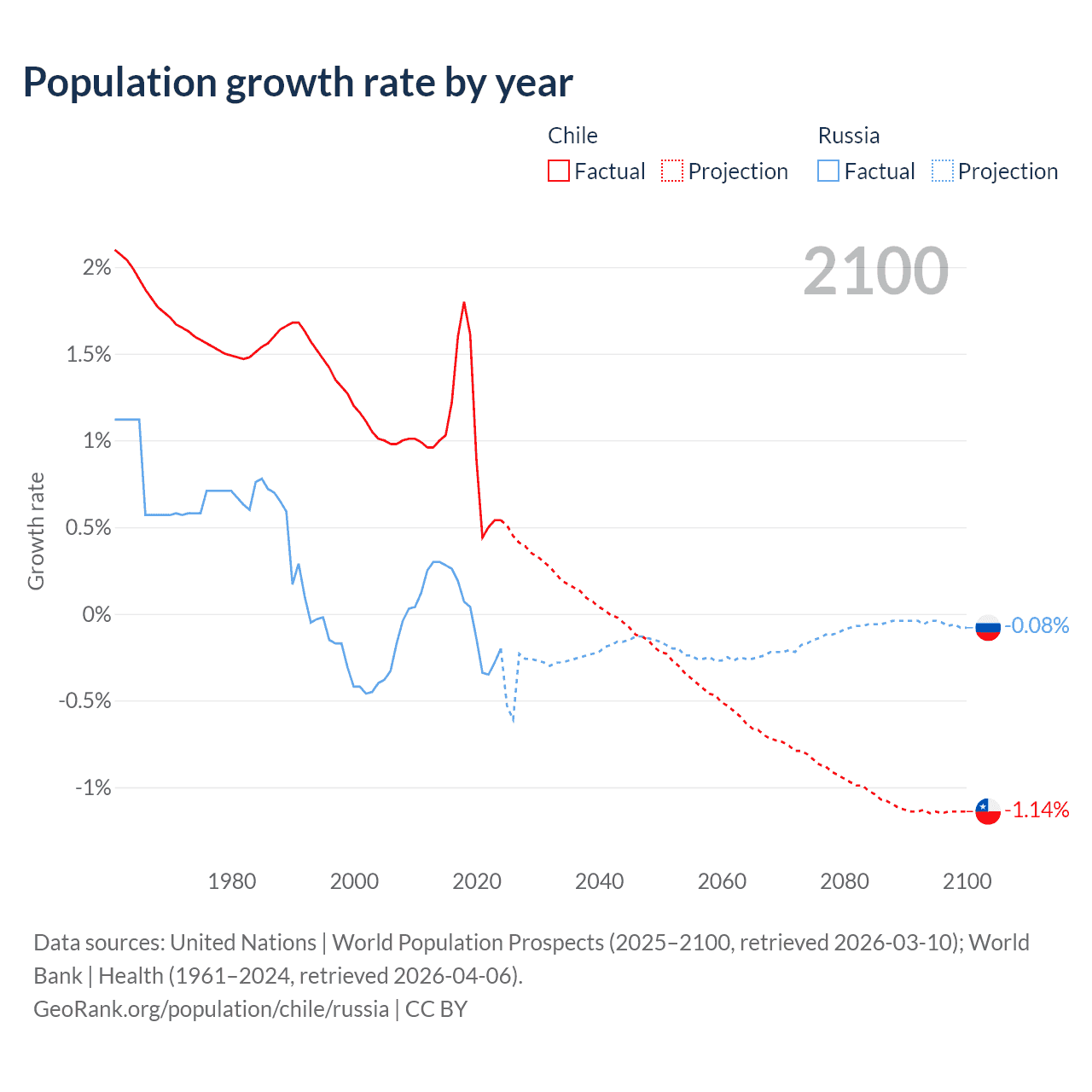 - For the last 10 years, Chile has had an average growth rate of +1.02% per year vs -0.02% in Russia.