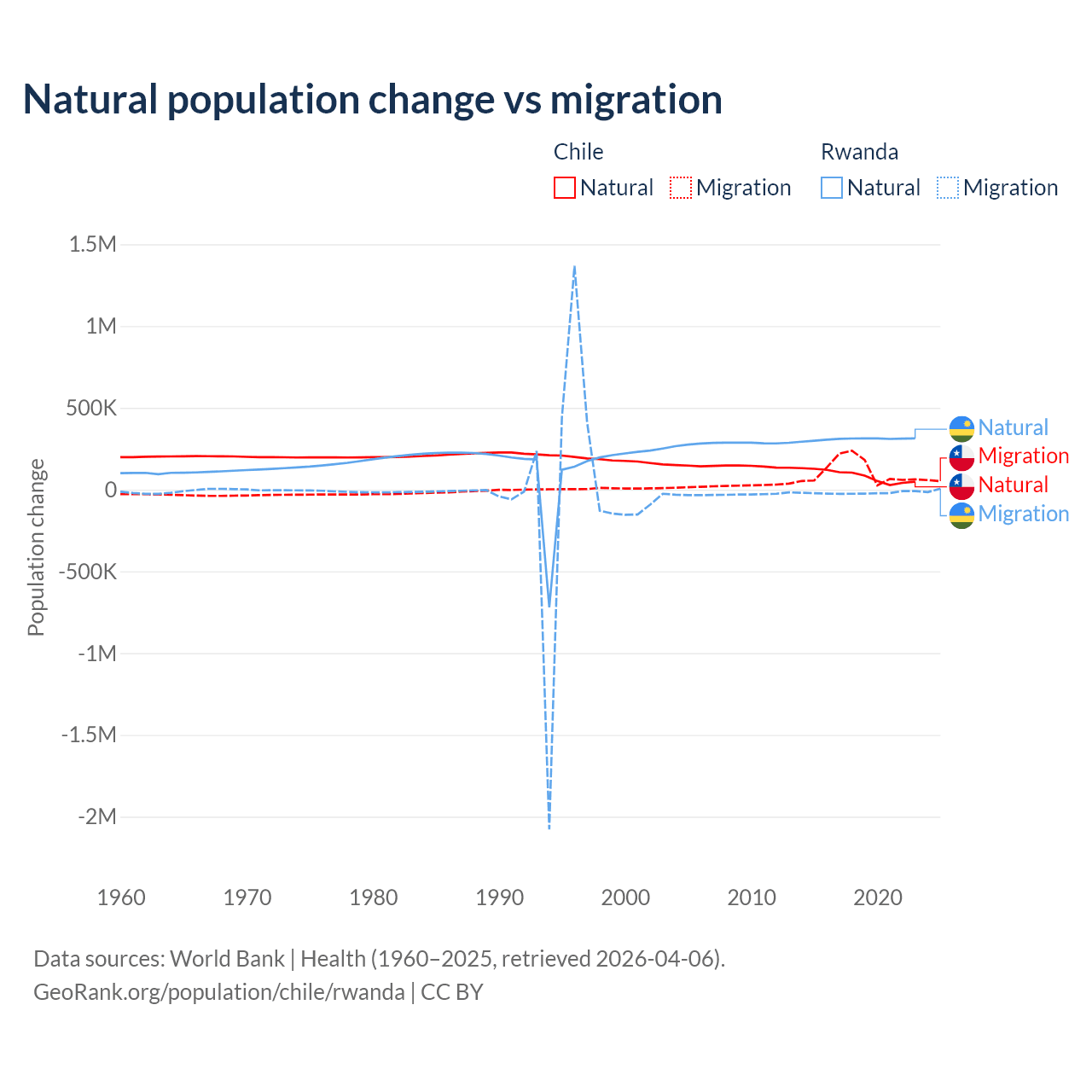Over the last 10 years, 43.5% of the population change in Chile is from natural causes (a gain of 844,683 people) and 56.5% is from migration (a gain of 1,097,597 people). In Rwanda 93.8% is from natural causes (a gain of 3,081,296 people) and 6.18% is from migration (a loss of 203,035 people).