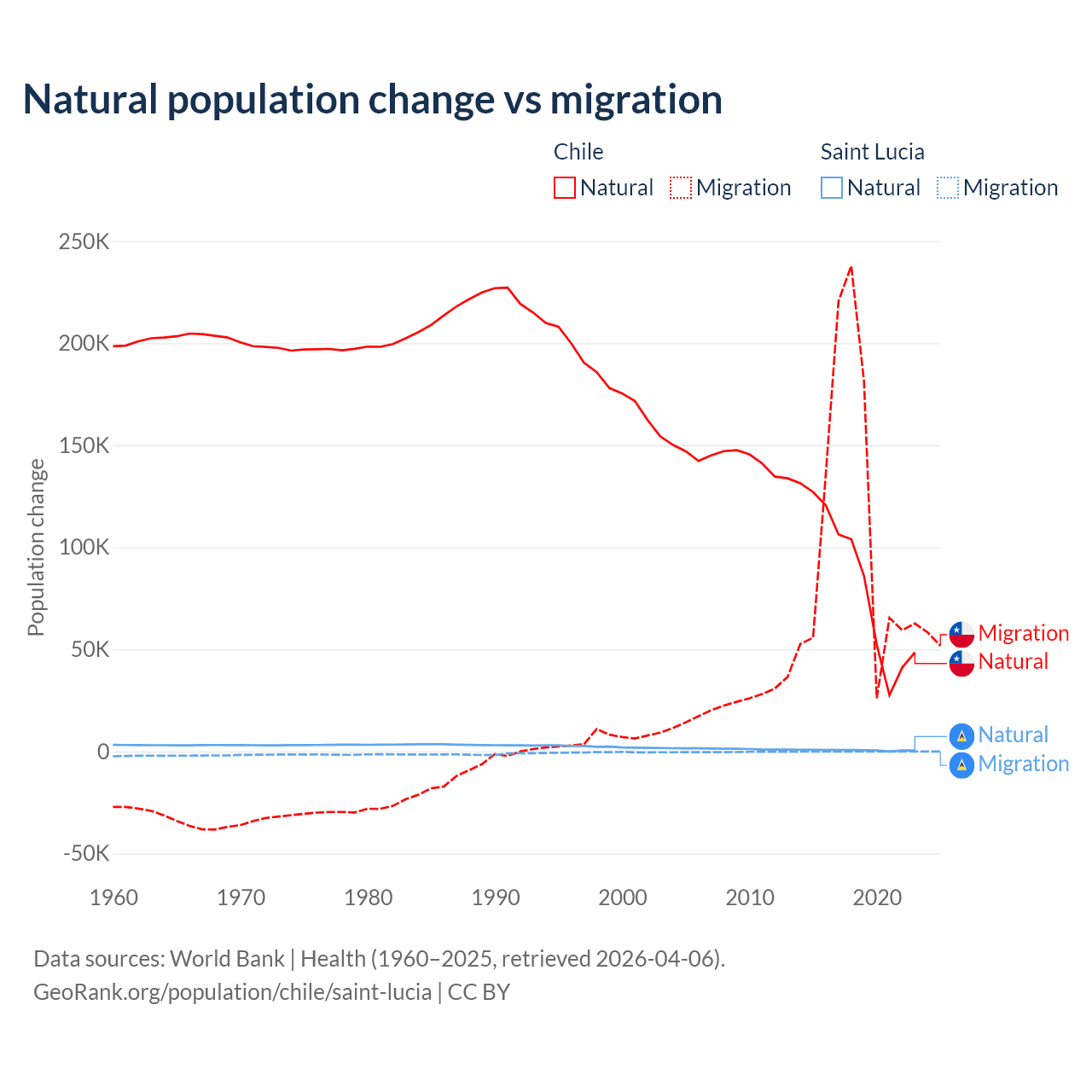 Over the last 10 years, 43.5% of the population change in Chile is from natural causes (a gain of 844,683 people) and 56.5% is from migration (a gain of 1,097,597 people). In Saint Lucia 95.7% is from natural causes (a gain of 6,039 people) and 4.31% is from migration (a loss of 272 people).