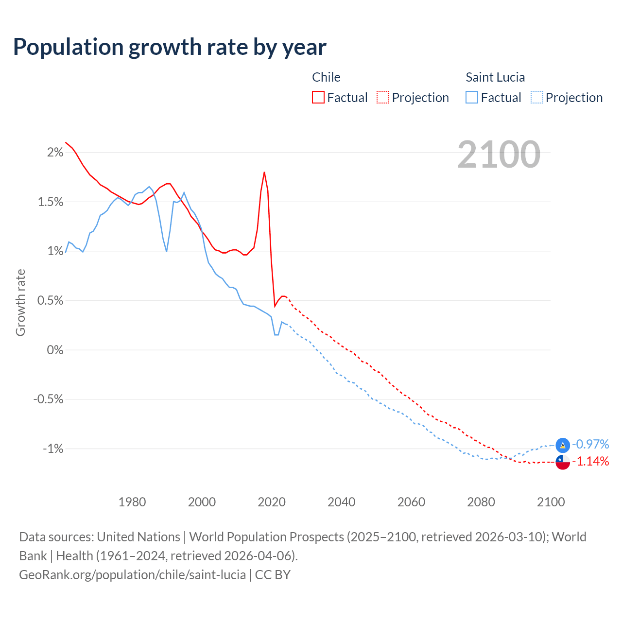 - For the last 10 years, Chile has had an average growth rate of +1.02% per year vs +0.33% in Saint Lucia.