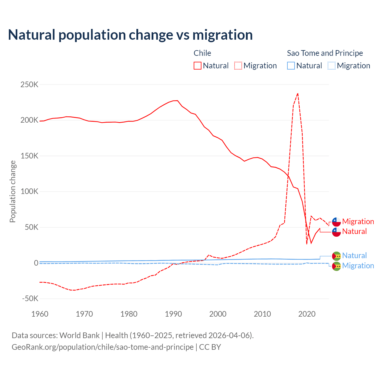 Over the last 10 years, 43.5% of the population change in Chile is from natural causes (a gain of 844,683 people) and 56.5% is from migration (a gain of 1,097,597 people). In Sao Tome and Principe 80.1% is from natural causes (a gain of 50,822 people) and 19.9% is from migration (a loss of 12,621 people).
