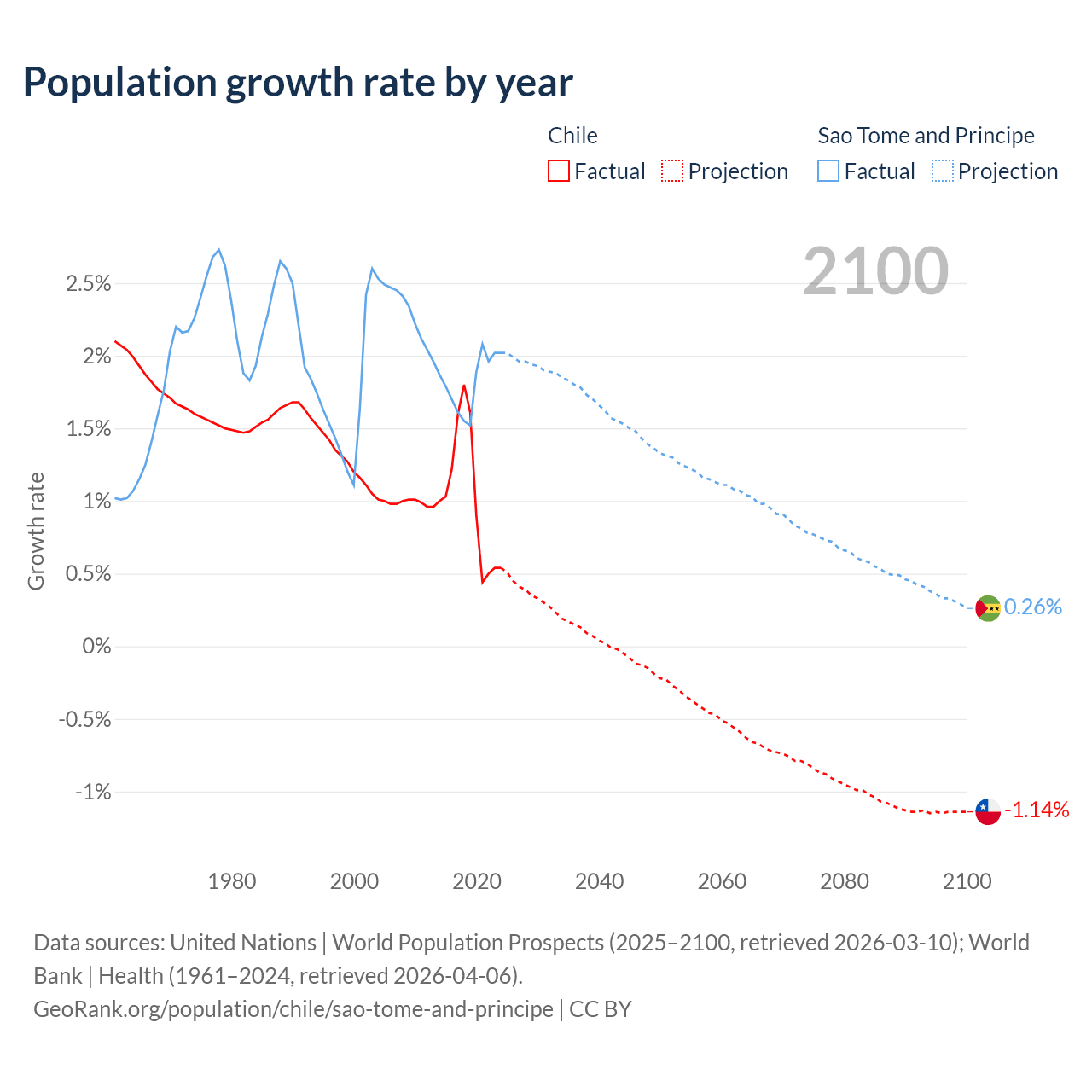 - For the last 10 years, Chile has had an average growth rate of +1.02% per year vs +1.82% in Sao Tome and Principe.