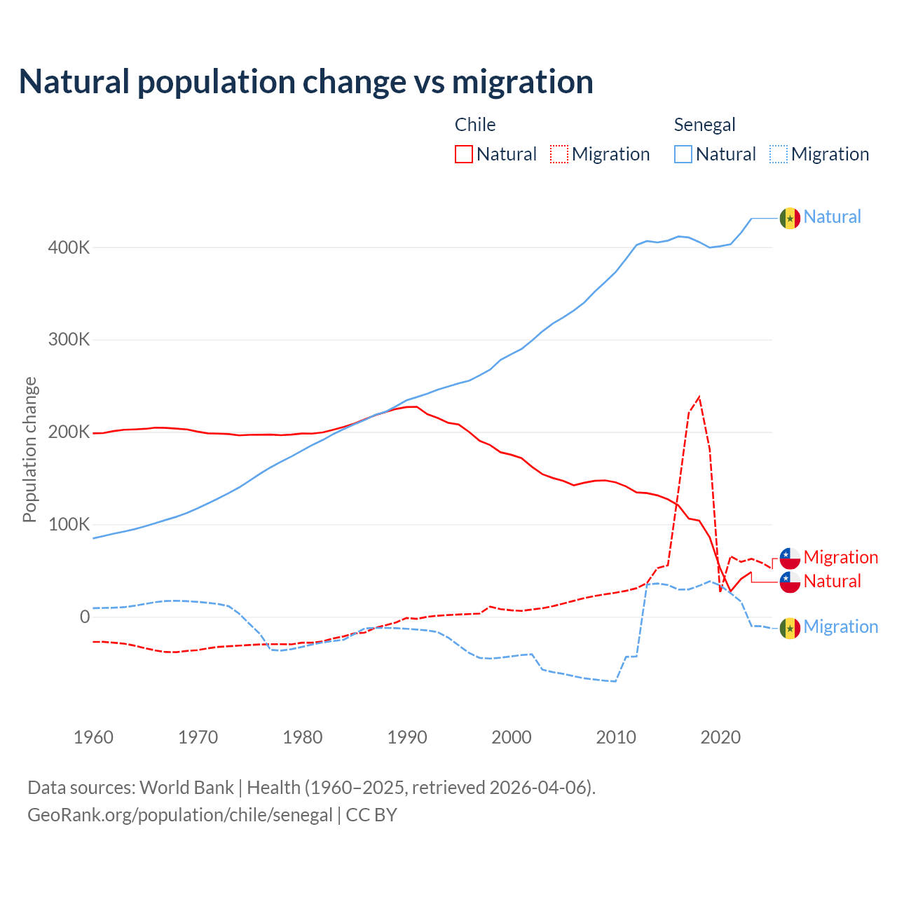 Over the last 10 years, 43.5% of the population change in Chile is from natural causes (a gain of 844,683 people) and 56.5% is from migration (a gain of 1,097,597 people). In Senegal 93.9% is from natural causes (a gain of 4,089,205 people) and 6.13% is from migration (a gain of 267,266 people).