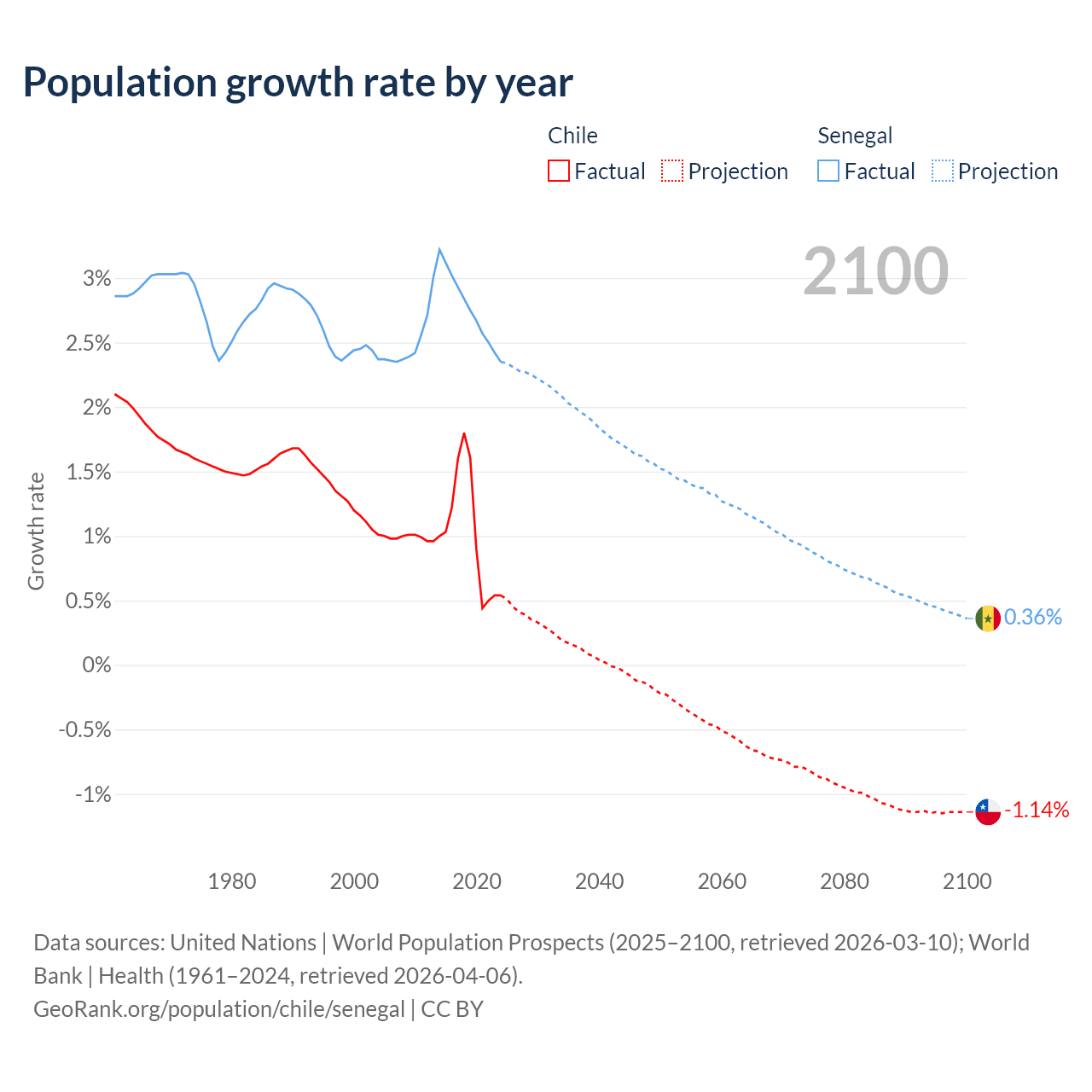 - For the last 10 years, Chile has had an average growth rate of +1.02% per year vs +2.76% in Senegal.