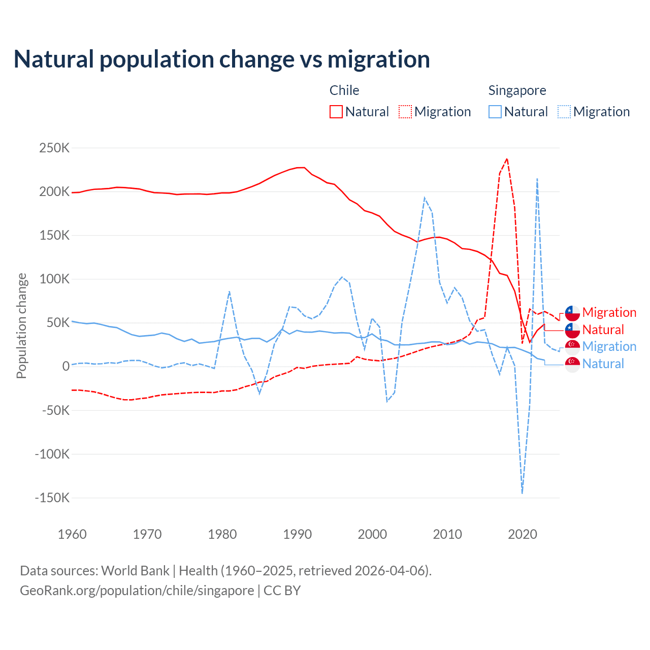 Over the last 10 years, 43.5% of the population change in Chile is from natural causes (a gain of 844,683 people) and 56.5% is from migration (a gain of 1,097,597 people). In Singapore 54.8% is from natural causes (a gain of 195,953 people) and 45.2% is from migration (a gain of 161,805 people).