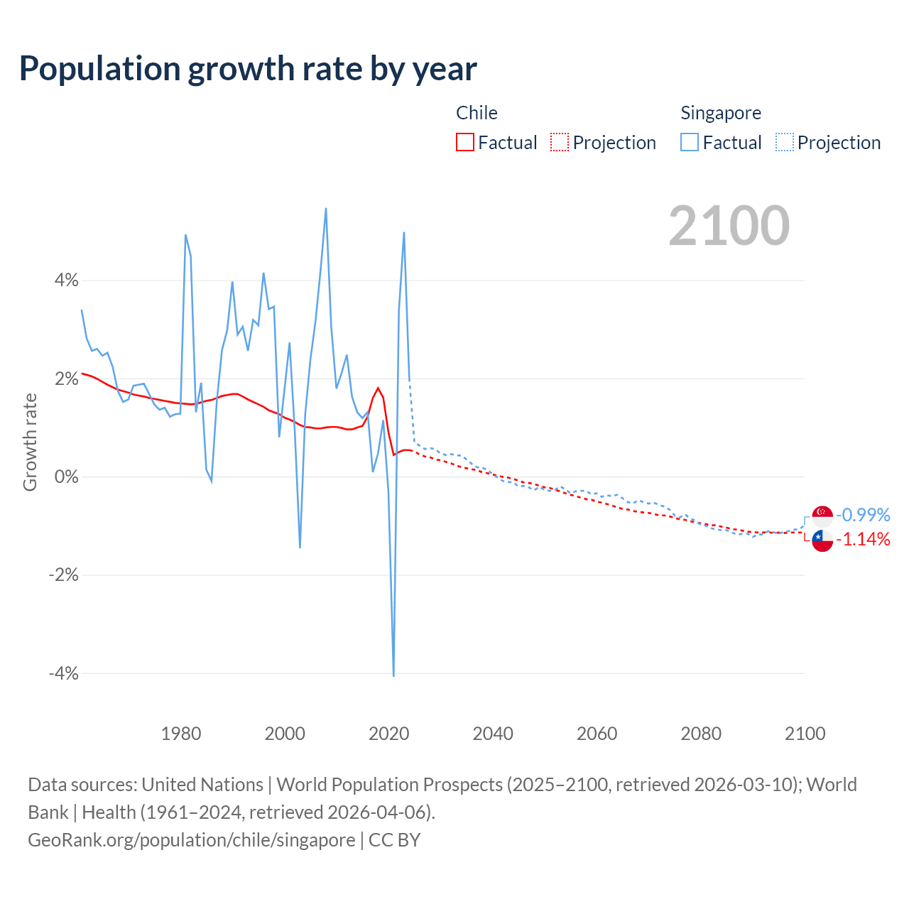 - For the last 10 years, Chile has had an average growth rate of +1.02% per year vs +1.04% in Singapore.