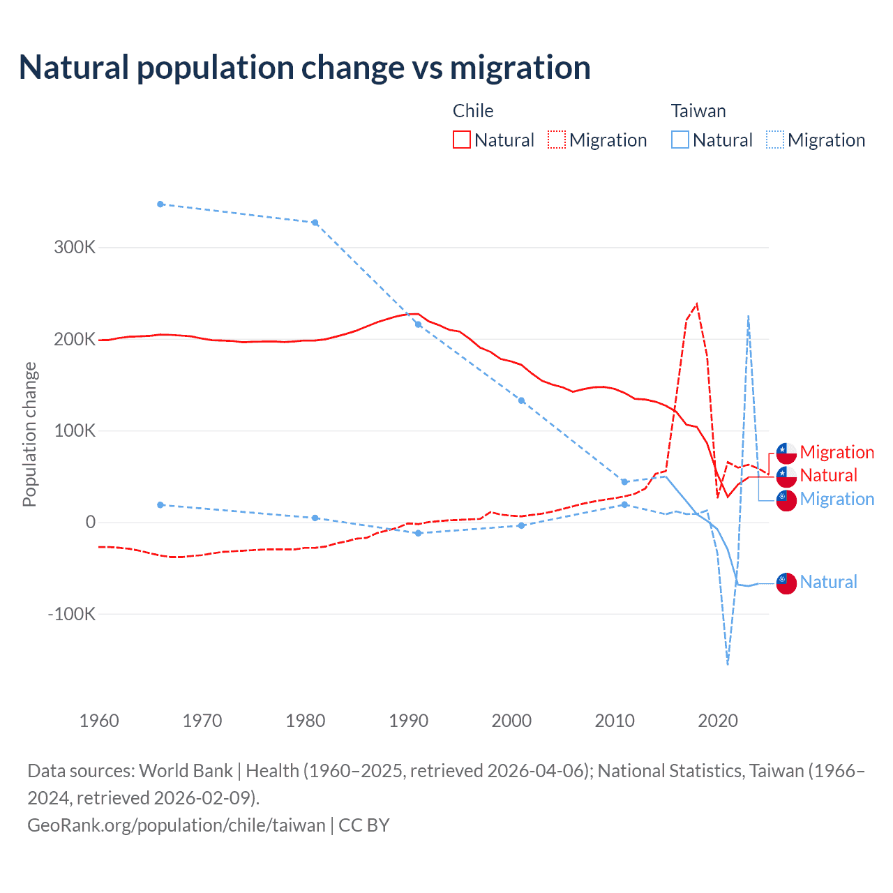 Over the last 10 years, 43.5% of the population change in Chile is from natural causes (a gain of 844,683 people) and 56.5% is from migration (a gain of 1,097,597 people). In Taiwan 56.7% is from natural causes (a loss of 57,467 people) and 43.3% is from migration (a gain of 43,884 people).
