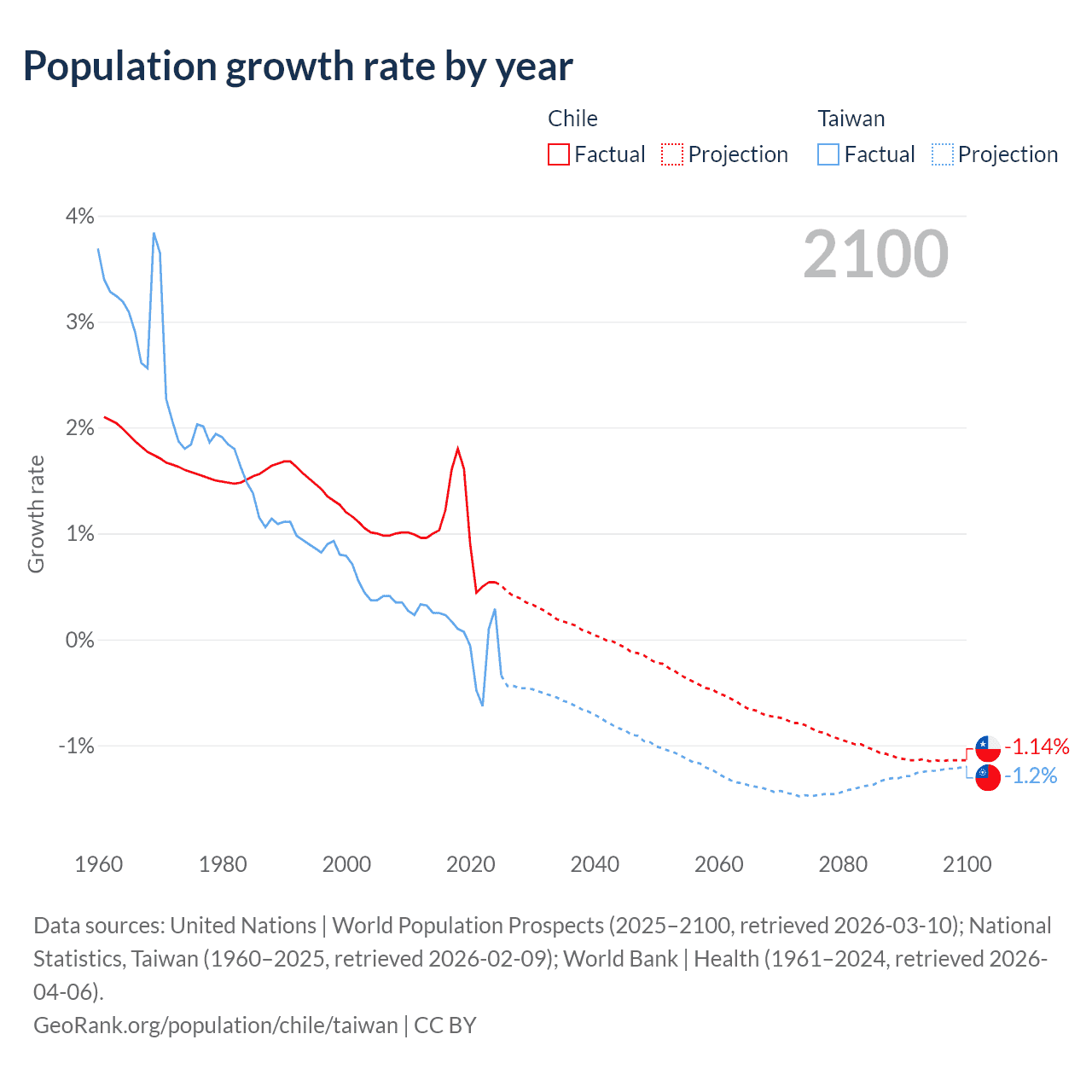 Data sources: World Bank | Health (1960–2024, retrieved 2026-04-06); United Nations | World Population Prospects (1960–2026, retrieved 2026-03-10); U.S. Census Bureau (1960–2025, retrieved 2026-02-08); National Statistics, Taiwan (1960–2025, retrieved 2026-02-09); Central Intelligence Agency (CIA) (2000–2019, retrieved 2026-02-20).