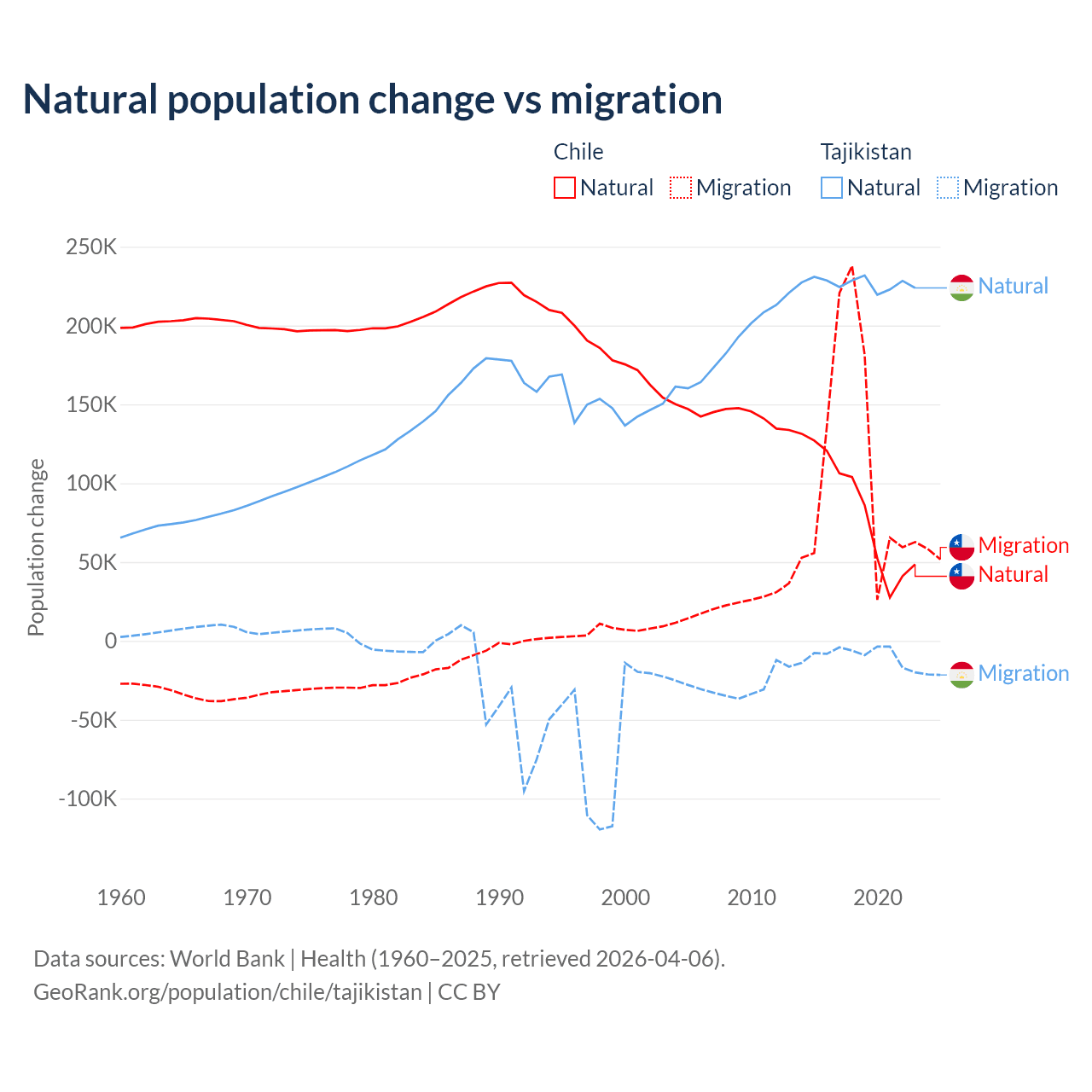 Over the last 10 years, 43.5% of the population change in Chile is from natural causes (a gain of 844,683 people) and 56.5% is from migration (a gain of 1,097,597 people). In Tajikistan 96% is from natural causes (a gain of 2,266,045 people) and 3.95% is from migration (a loss of 93,205 people).