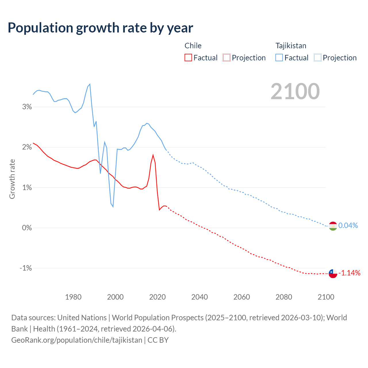 - For the last 10 years, Chile has had an average growth rate of +1.02% per year vs +2.33% in Tajikistan.