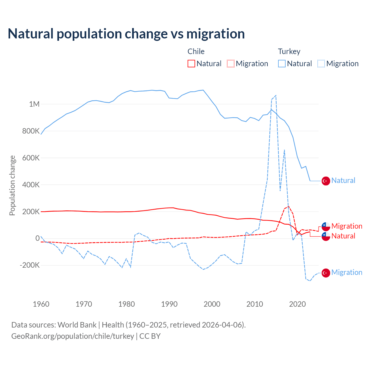 Over the last 10 years, 43.5% of the population change in Chile is from natural causes (a gain of 844,683 people) and 56.5% is from migration (a gain of 1,097,597 people). In Turkey 73% is from natural causes (a gain of 7,333,352 people) and 27% is from migration (a gain of 2,718,916 people).